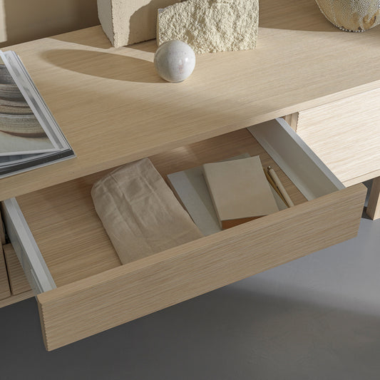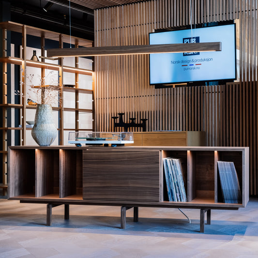Du velger selv oppsettet med åpne rom, skuffer eller dører. Alle fronter har trykkåpning uten synlige håndtak, og produseres fra samme finerplate for å bevare et sømløst og harmonisk uttrykk. Resultatet er et lavmælt og sofistikert møbel som løfter både lydopplevelsen og interiøret.