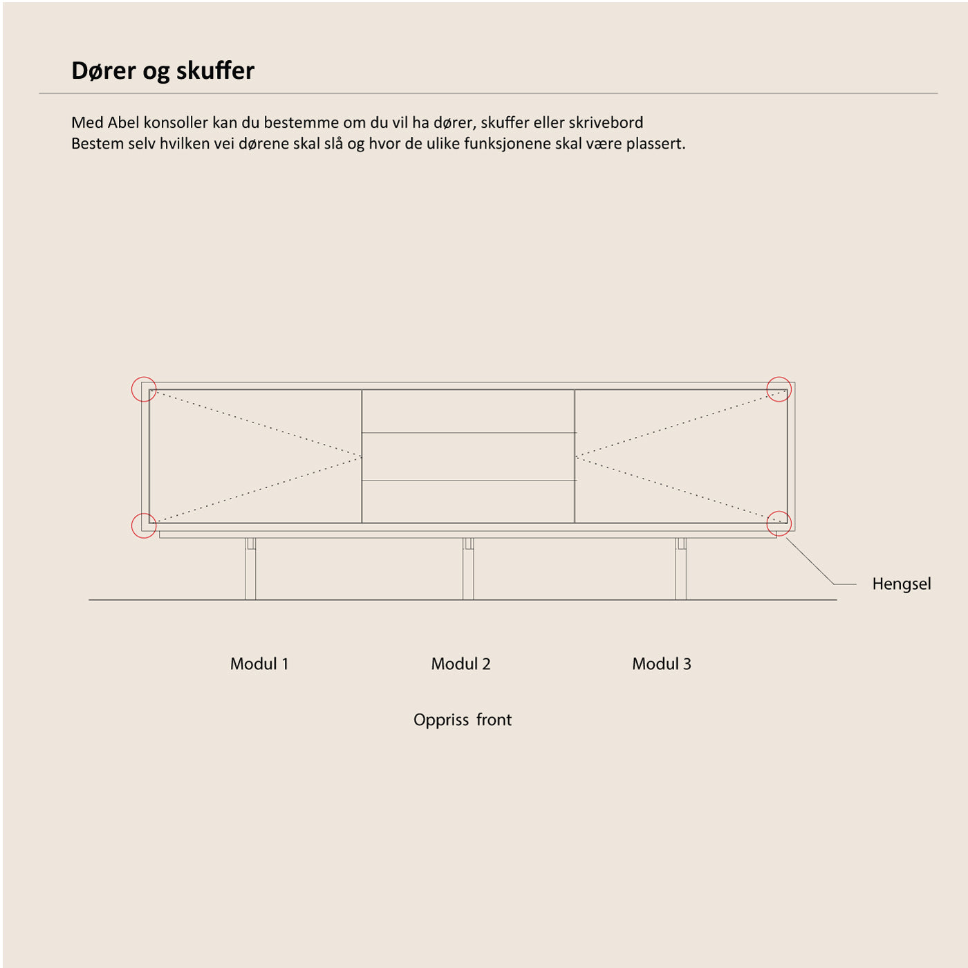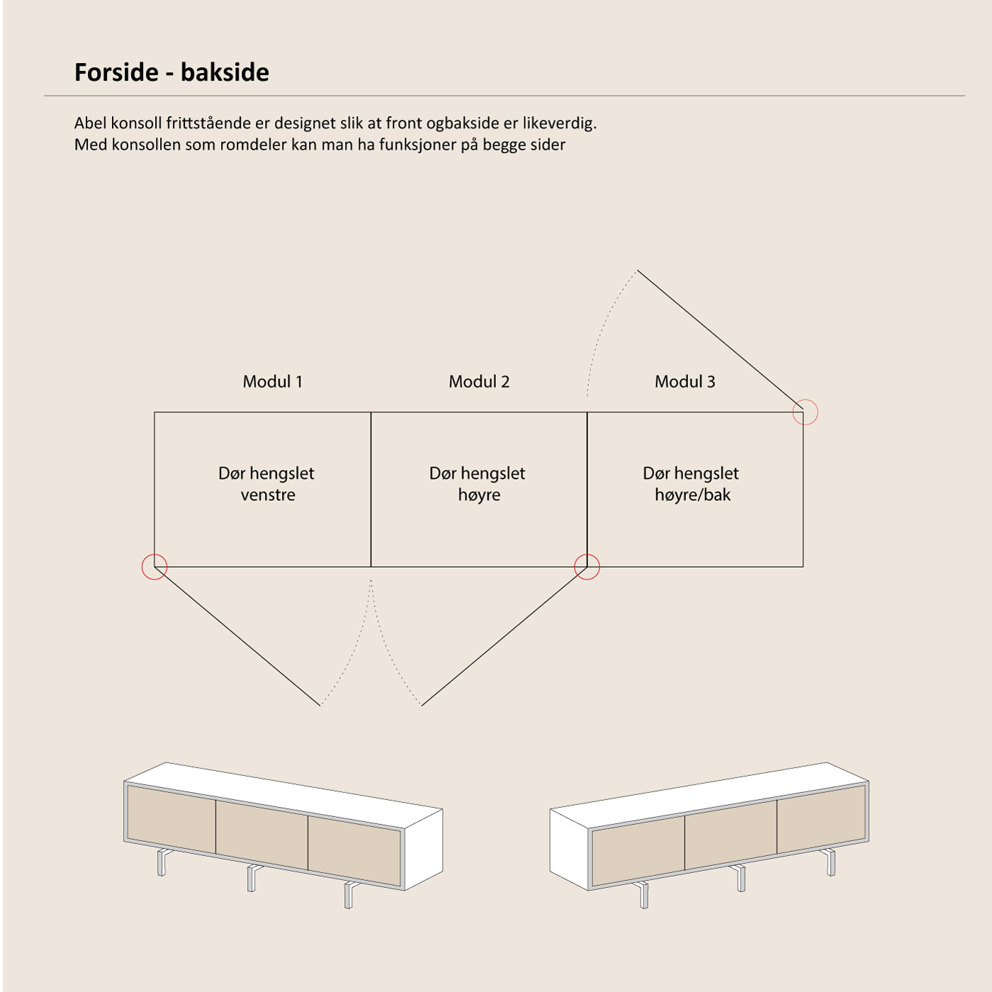Frittstående konsoll Konsollene er designet med fronter på begge sider. Slik kan de stå fritt i rommet som en romdeler, en benk eller fungere som en vanlig skjenk. Konsollene produseres i mange standard størrelser men kan også tilvirkes på skreddersøm. Bestem selv hvilke funksjoner de forskjellige modulene i konsollene skal ha; Dører - Skuffer - Skrivebord - TV - heis - Åpen. Alle fronter har trykk åpning, uten synlige håndtak. Med vår unike produksjon tilvirkes frontene av samme finerplate, slik at mønsteret forblir uavbrutt over hele fronten. |
