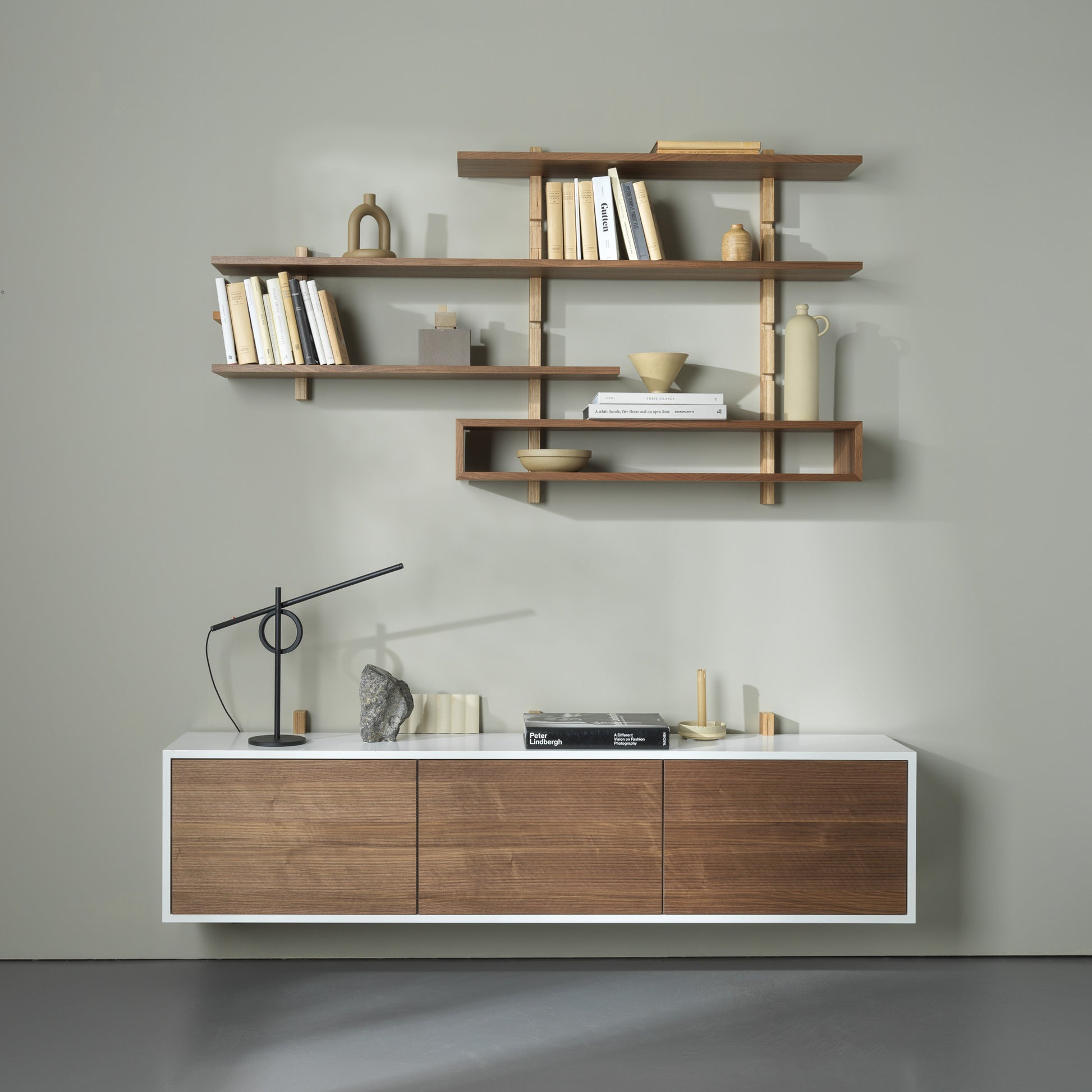Konsollene produseres i mange standard størrelser men kan også tilvirkes på skreddersøm. Bestem selv hvilke funksjoner de forskjellige modulene i konsollene skal ha; Dører - Skuffer - Skrivebord - TV - heis - Åpen. Alle fronter har trykk åpning, uten synlige håndtak. Med vår unike produksjon tilvirkes frontene av samme finerplate, slik at mønsteret forblir uavbrutt over hele fronten. Vegghengt konsoll Konsollene henges opp i listene til Abel system slik at man kommer fri gra gulvet. Abel systems unike konstruksjon gjør det enkelt å skjule ledninger. Siden konsollene ikke har bakplate og en spalteavstand fra vegg står man fritt til å kunne trekker ledninger mellom modulene og opp til toppen, samtidig som konsollen vil skjule ledninger og støpsel på vegg. |
