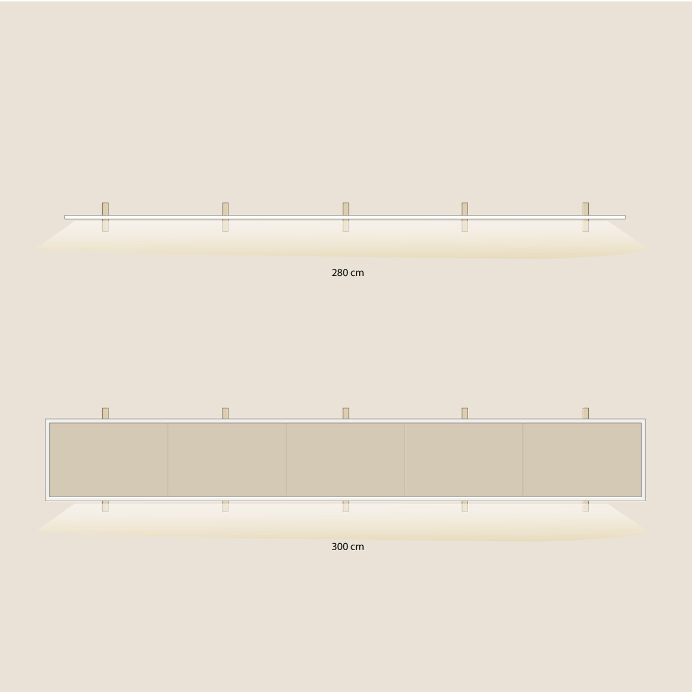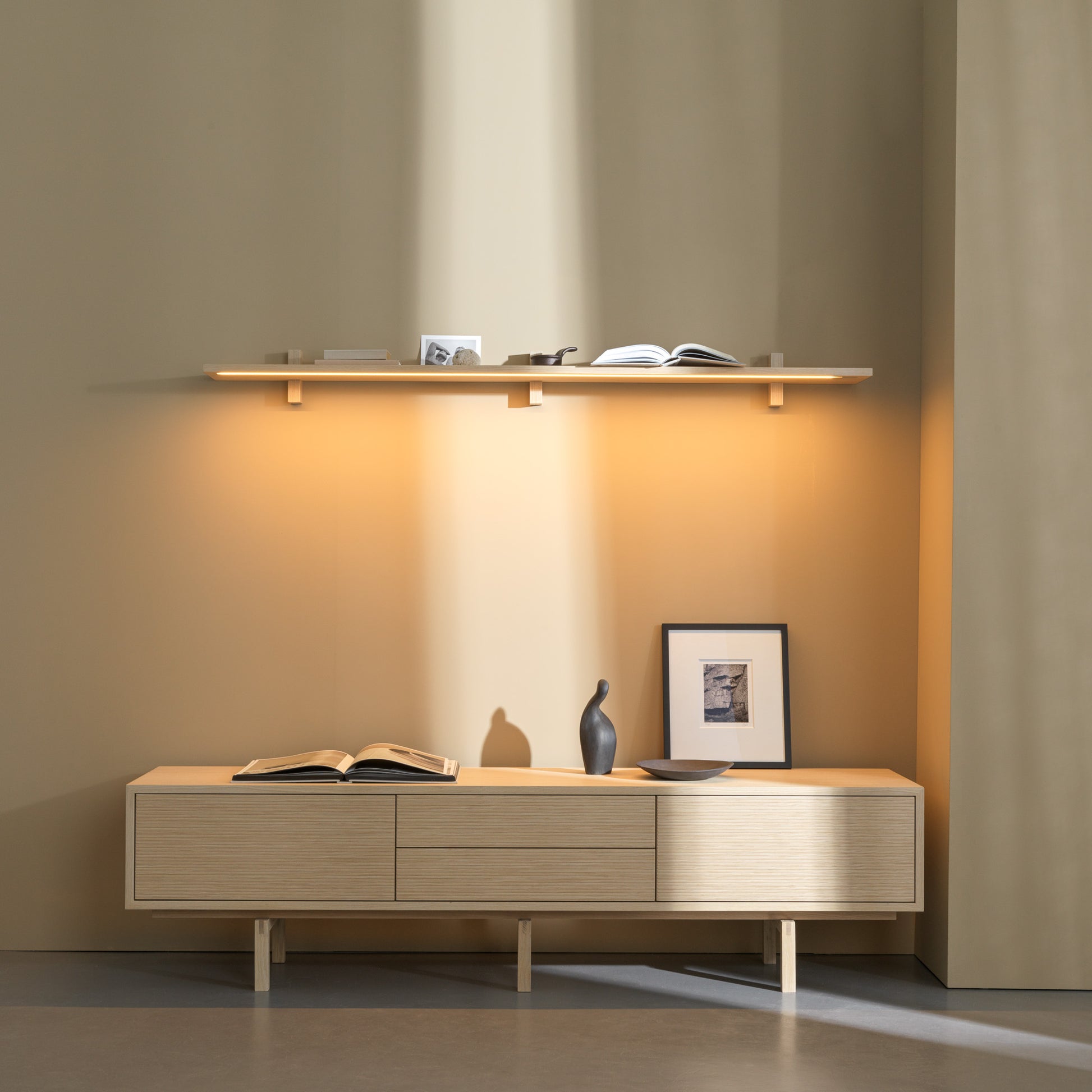 Lyslisten kan integreres sømløst i hyller, rammer og konsoller. Lyset kan dimmes, og fungerer like godt over kjøkkenbenken som arbeidslys og dimmet ned som et varmt behagelig lys for lesestunden på sengekanten. Dimmerfunksjonen har minne, og bredden på lyset kan varieres fra 40 cm til 300 cm. | |