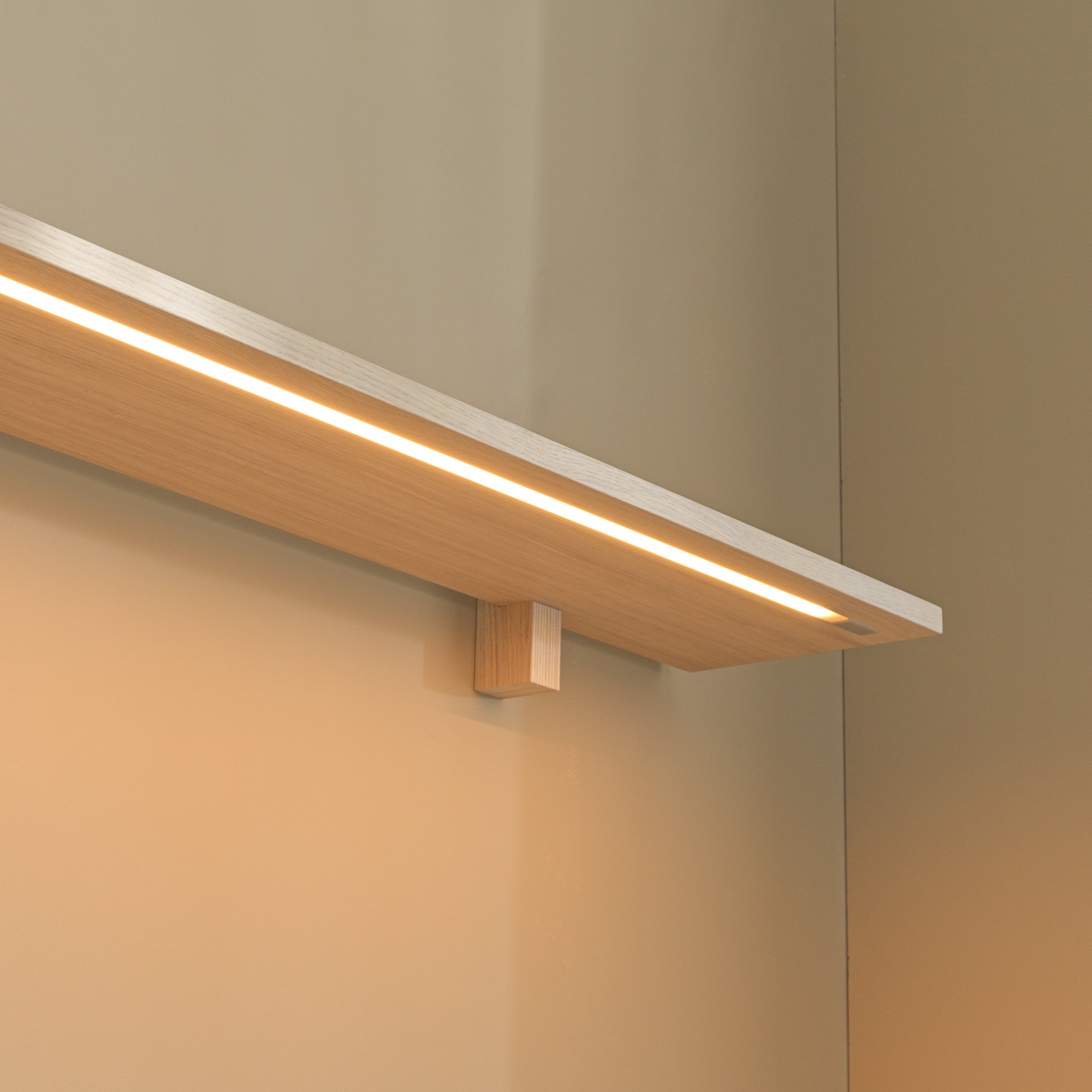 Lyslisten kan integreres sømløst i hyller, rammer og konsoller. Lyset kan dimmes, og fungerer like godt over kjøkkenbenken som arbeidslys og dimmet ned som et varmt behagelig lys for lesestunden på sengekanten. Dimmerfunksjonen har minne, og bredden på lyset kan varieres fra 40 cm til 300 cm. | |