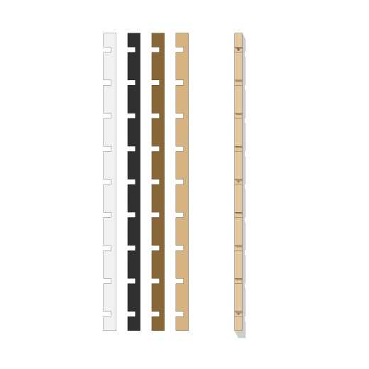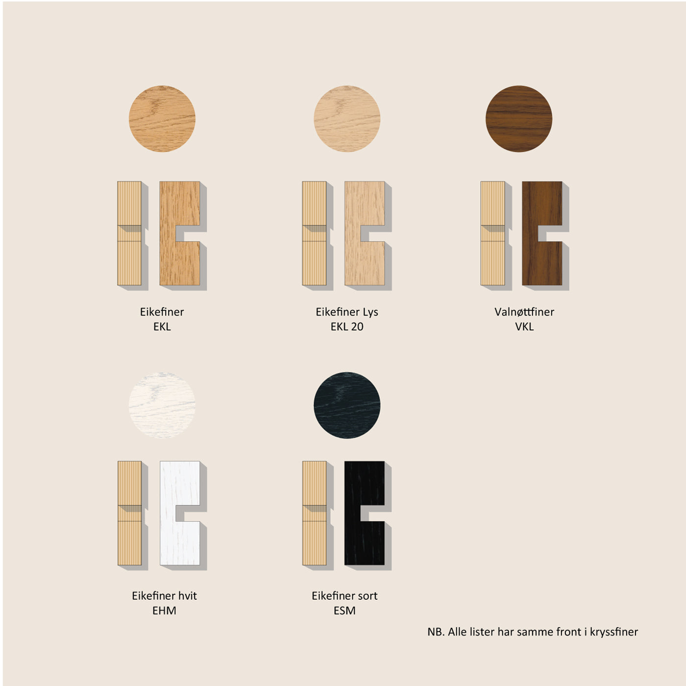 Farger: Eik, Eik Lys, Valnøtt, Sort & Hvit. Alle listene har den samme overflaten i front i kryssfiner. |