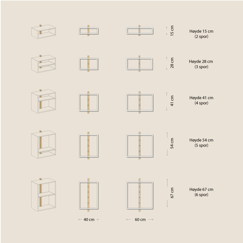 Detaljer NB. Lister er ikke inkludert i prisoppsettet. Rammer på 40 og 60 cm kan monteres på singel list, men har mindre bæreevne enn dobbel list. Til bøker og tyngre gjenstander anbefales derfor dobbel list. |