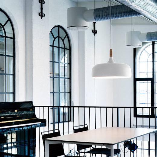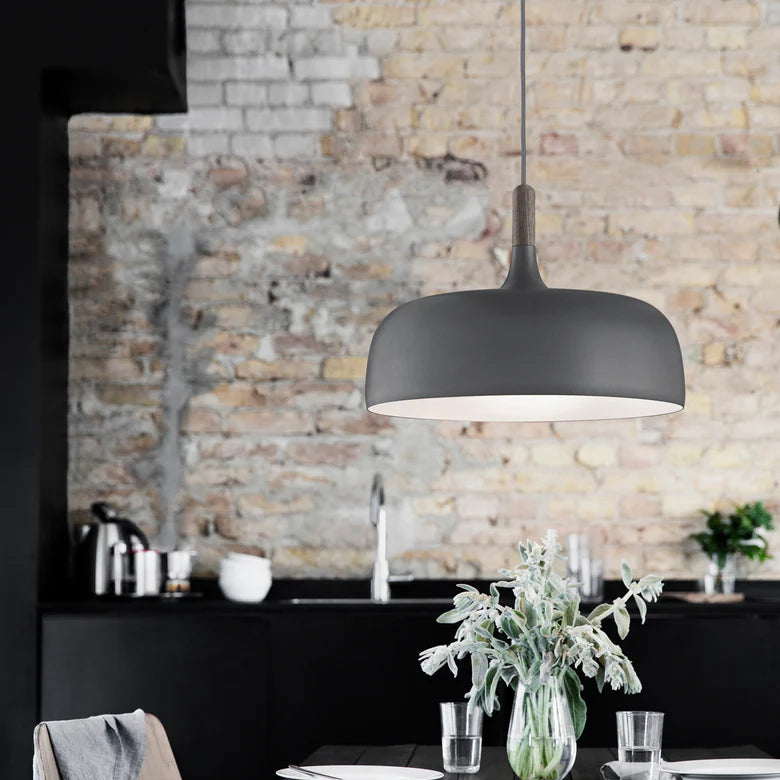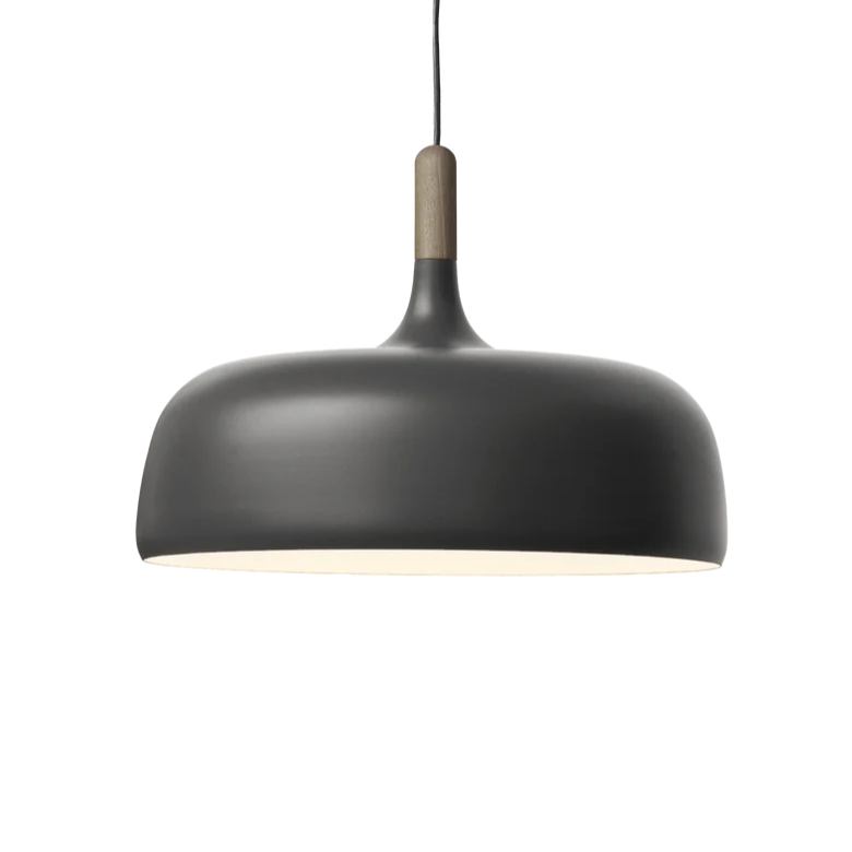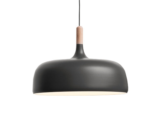 Acorns form er inspirert av en naturlig form. Skjermen ligner det tomme skallet fra en eikenøtt, som blir hul når den modne nøtten har brutt seg fri. Som en eikenøttstamme, smalner toppen av skyggen til en taktil form. Strømlinjeformet og sofistikert, er lampen hengt opp fra taket i en silkekabel som skjuler strømkabelen inni den. Lampen festes til taket med en himlingshylse laget i samme stil som skjermen. Denne pendellampen tilhører en ny serie design som gjenskaper naturens skjønnhet i et funksjonelt objekt. Lampen er laget i aluminium og bøk eller valnøtt, og malt enten hvit eller grå. Lampen kombinerer naturlige materialer med upretensiøse farger. Den matt svarte versjonen fremhever Acorns særegne form og skaper større kontrast med omgivelsene. Acorn er et naturlig supplement til moderne interiør, og en flott måte å skinne lys over bordplater, pulter og arbeidsflater. |