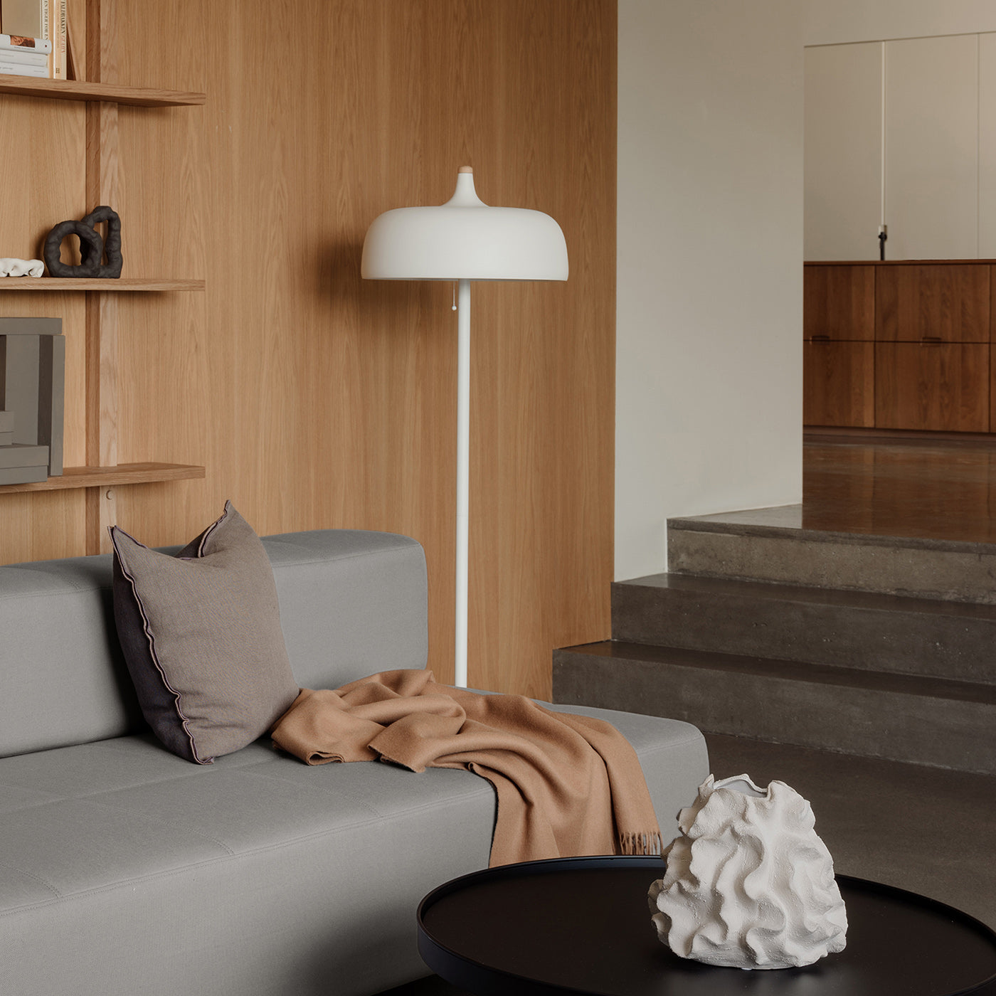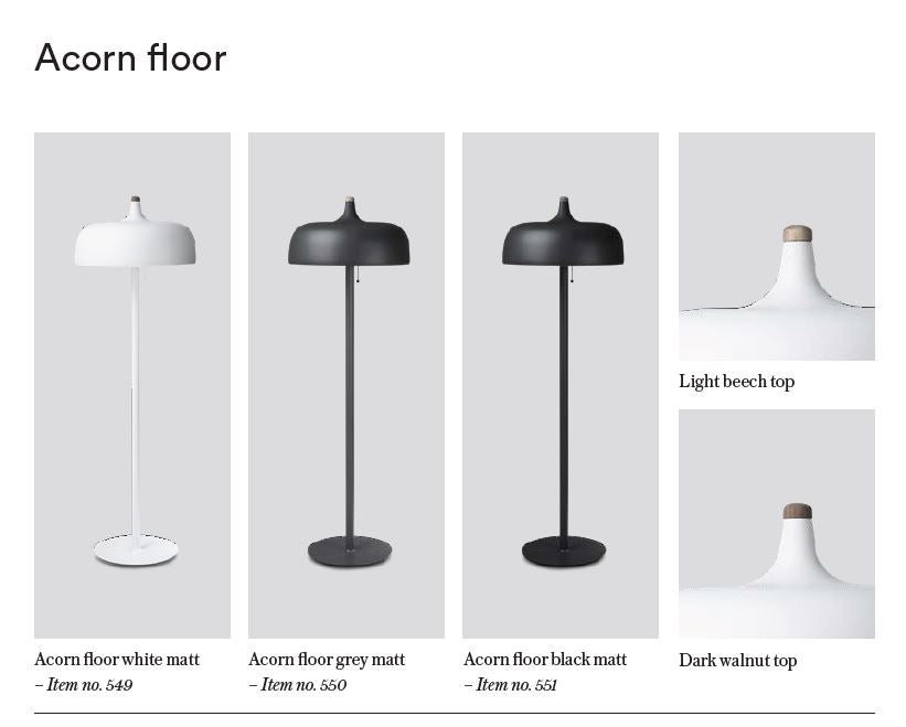 Acorns form er inspirert av en naturlig form. Skjermen ligner det tomme skallet fra en eikenøtt, som blir hul når den modne nøtten har brutt seg fri. Som en eikenøttstamme, smalner toppen av skyggen til en taktil form. Strømlinjeformet og sofistikert, er lampen hengt opp fra taket i en silkekabel som skjuler strømkabelen inni den. Lampen festes til taket med en himlingshylse laget i samme stil som skjermen. Denne pendellampen tilhører en ny serie design som gjenskaper naturens skjønnhet i et funksjonelt objekt. Lampen er laget i aluminium og bøk eller valnøtt, og malt enten hvit eller grå. Lampen kombinerer naturlige materialer med upretensiøse farger. Den matt svarte versjonen fremhever Acorns særegne form og skaper større kontrast med omgivelsene. Acorn er et naturlig supplement til moderne interiør, og en flott måte å skinne lys over bordplater, pulter og arbeidsflater. |