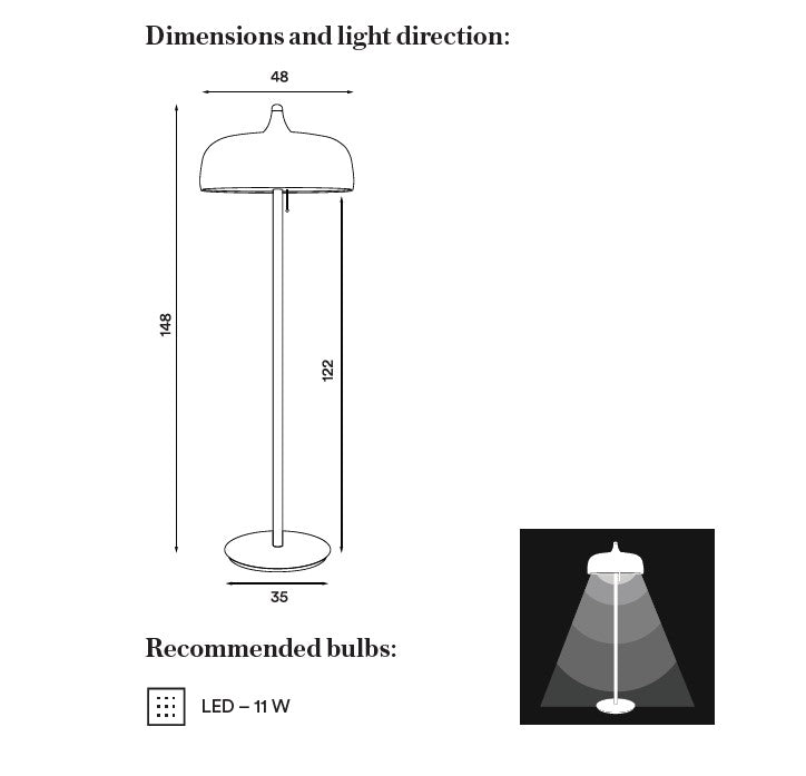 Product type: Floor lamp Design: Atle Tveit, 2021 Shade material: Aluminium Shade and body colour: White, grey or black Shade inner colour: White Body material: Steel Wooden top part: Light beech or dark walnut (both colours are included) Wire: White (white version), or black (grey and black versions), 200 cm Switch: Pull string switch (on/off) Bulb: E27, Max. 3 x 13 W LED only Voltage: 220V - 240V ~ 50/60Hz Net weight: 13.7 g |