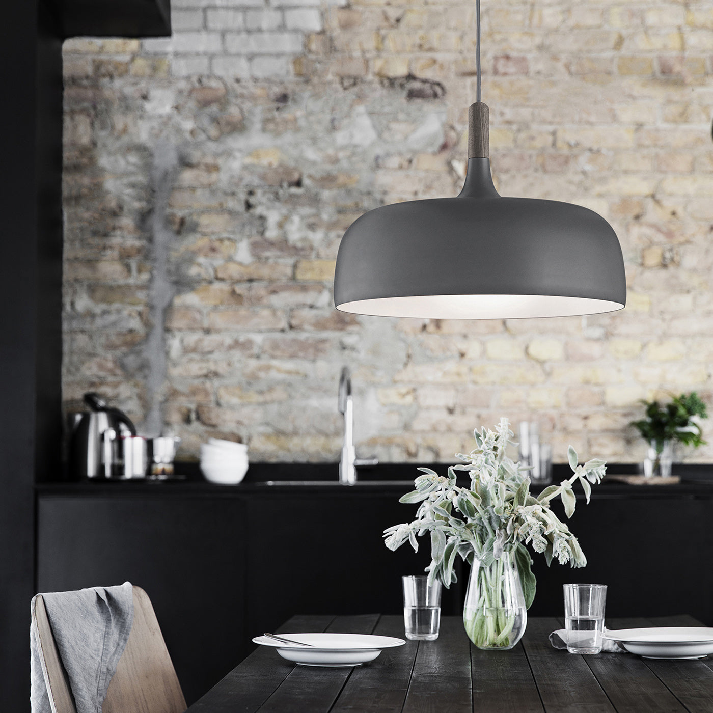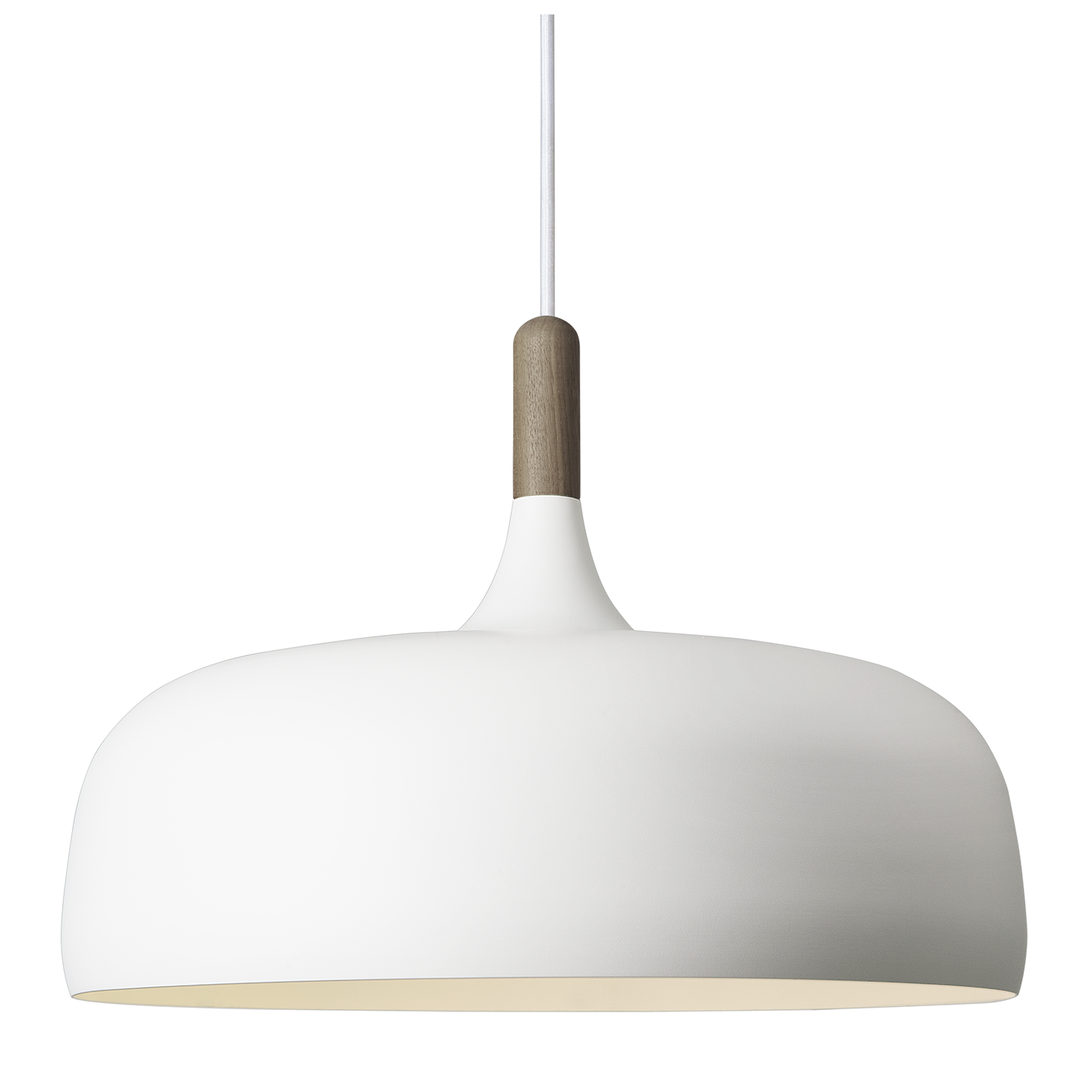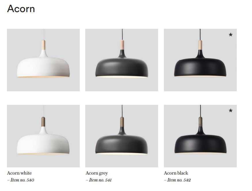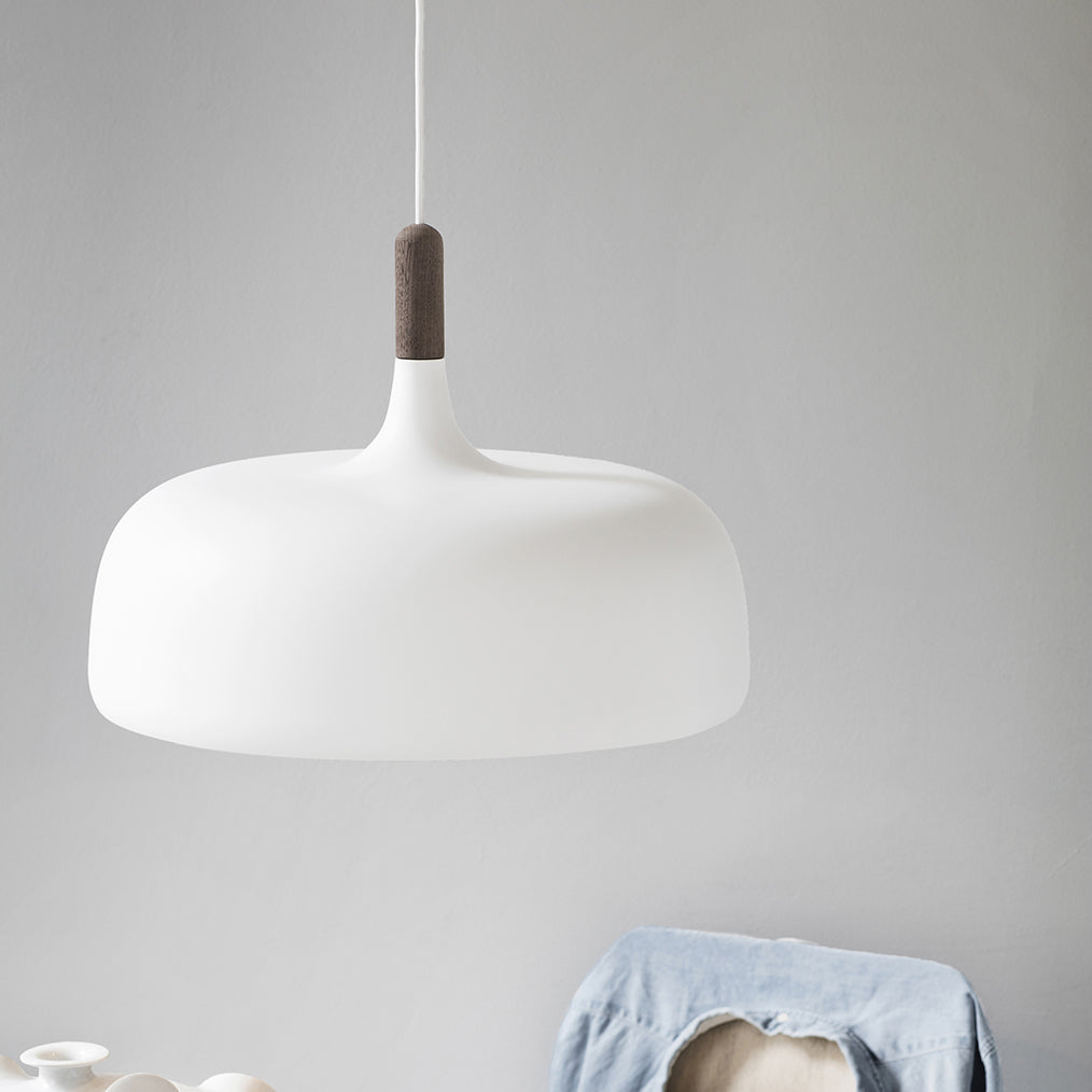 Acorns form er inspirert av en naturlig form. Skjermen ligner det tomme skallet fra en eikenøtt, som blir hul når den modne nøtten har brutt seg fri. Som en eikenøttstamme, smalner toppen av skyggen til en taktil form. Strømlinjeformet og sofistikert, er lampen hengt opp fra taket i en silkekabel som skjuler strømkabelen inni den. Lampen festes til taket med en himlingshylse laget i samme stil som skjermen. Denne pendellampen tilhører en ny serie design som gjenskaper naturens skjønnhet i et funksjonelt objekt. Lampen er laget i aluminium og bøk eller valnøtt, og malt enten hvit eller grå. Lampen kombinerer naturlige materialer med upretensiøse farger. Den matt svarte versjonen fremhever Acorns særegne form og skaper større kontrast med omgivelsene. Acorn er et naturlig supplement til moderne interiør, og en flott måte å skinne lys over bordplater, pulter og arbeidsflater. |