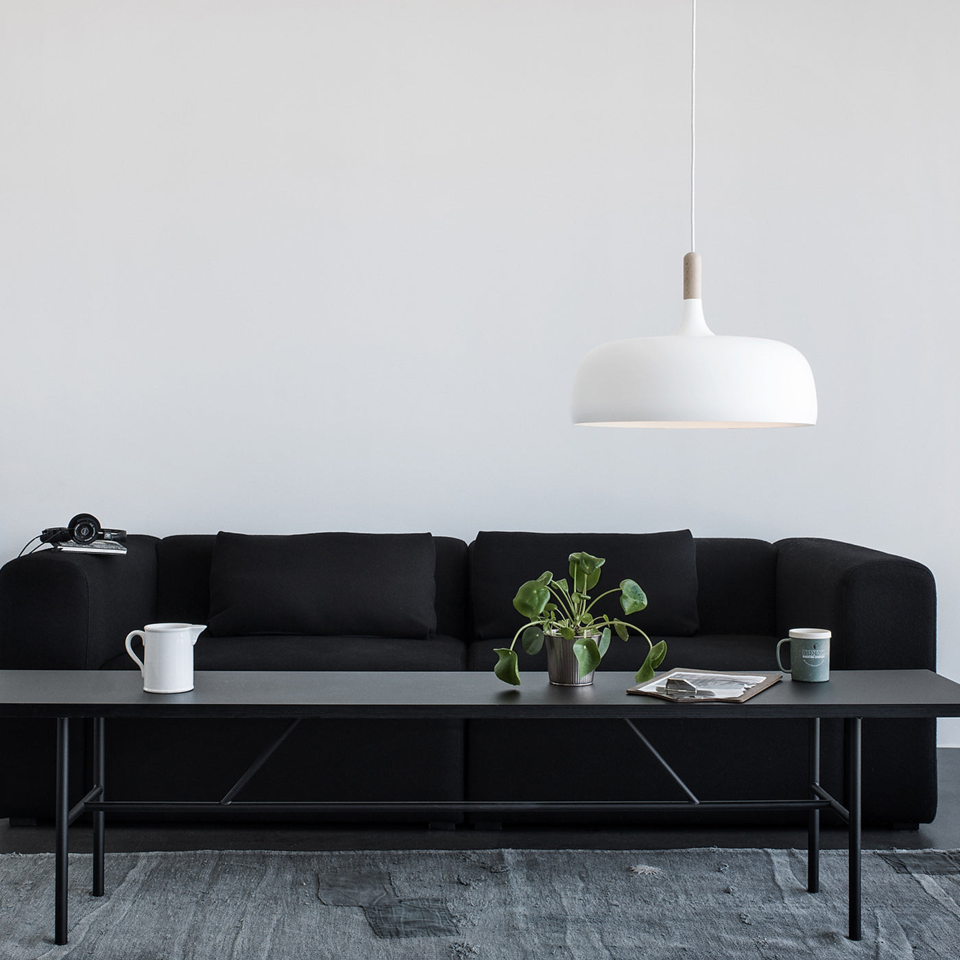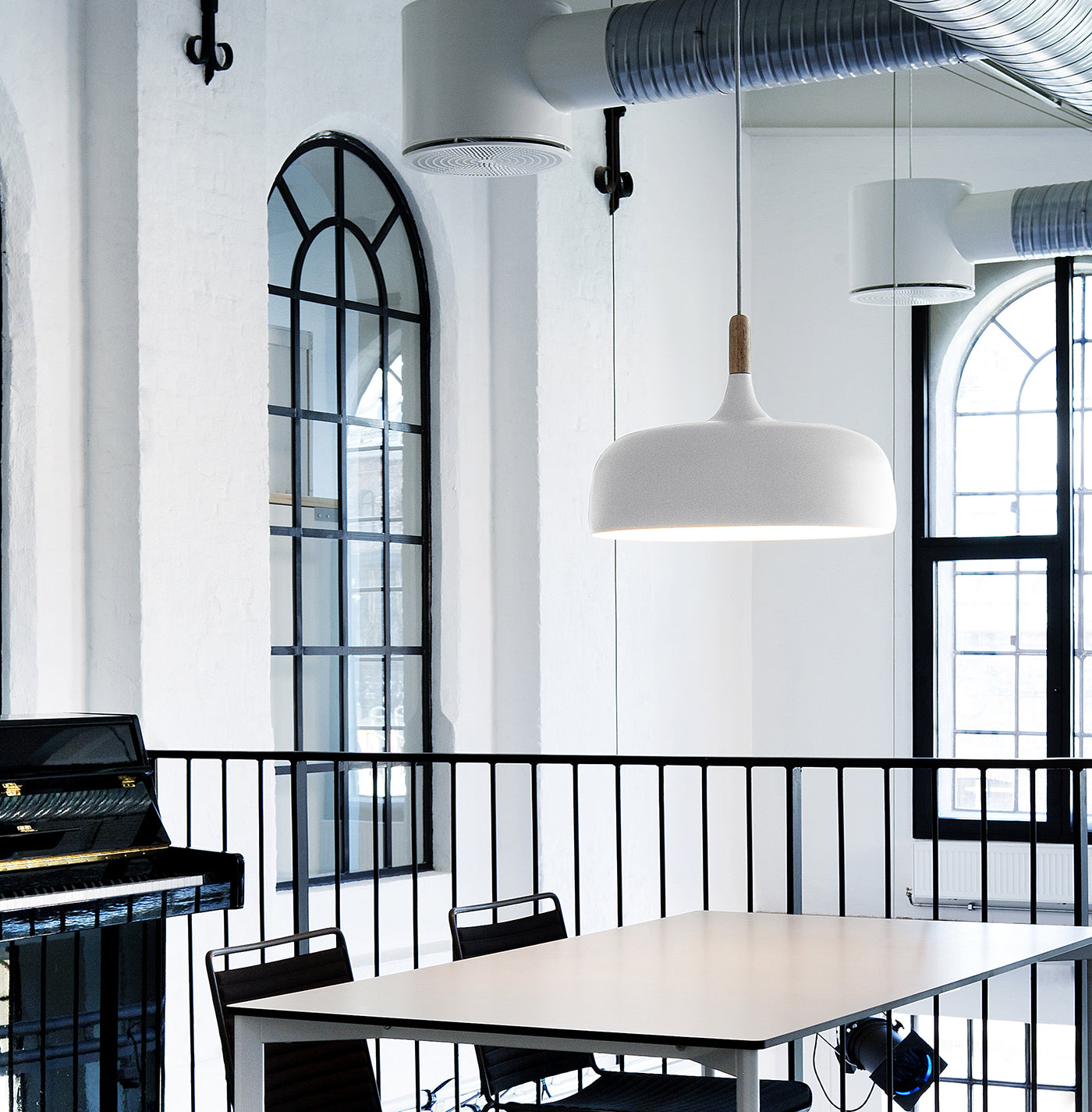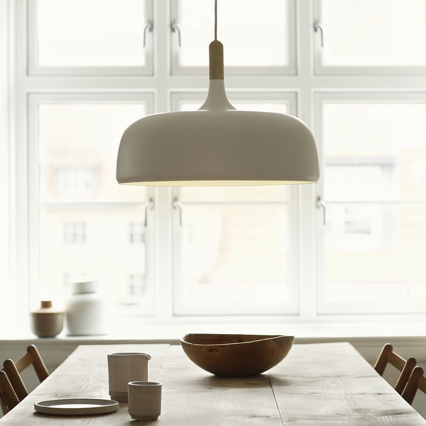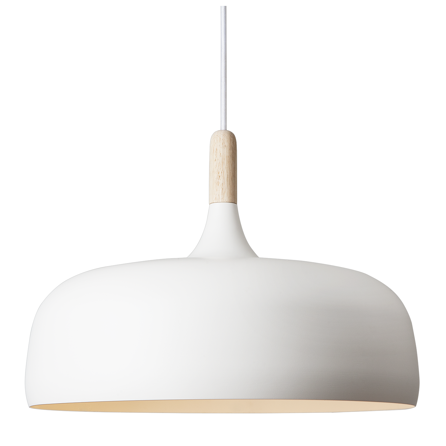 Acorns form er inspirert av en naturlig form. Skjermen ligner det tomme skallet fra en eikenøtt, som blir hul når den modne nøtten har brutt seg fri. Som en eikenøttstamme, smalner toppen av skyggen til en taktil form. Strømlinjeformet og sofistikert, er lampen hengt opp fra taket i en silkekabel som skjuler strømkabelen inni den. Lampen festes til taket med en himlingshylse laget i samme stil som skjermen. Denne pendellampen tilhører en ny serie design som gjenskaper naturens skjønnhet i et funksjonelt objekt. Lampen er laget i aluminium og bøk eller valnøtt, og malt enten hvit eller grå. Lampen kombinerer naturlige materialer med upretensiøse farger. Den matt svarte versjonen fremhever Acorns særegne form og skaper større kontrast med omgivelsene. Acorn er et naturlig supplement til moderne interiør, og en flott måte å skinne lys over bordplater, pulter og arbeidsflater. |
