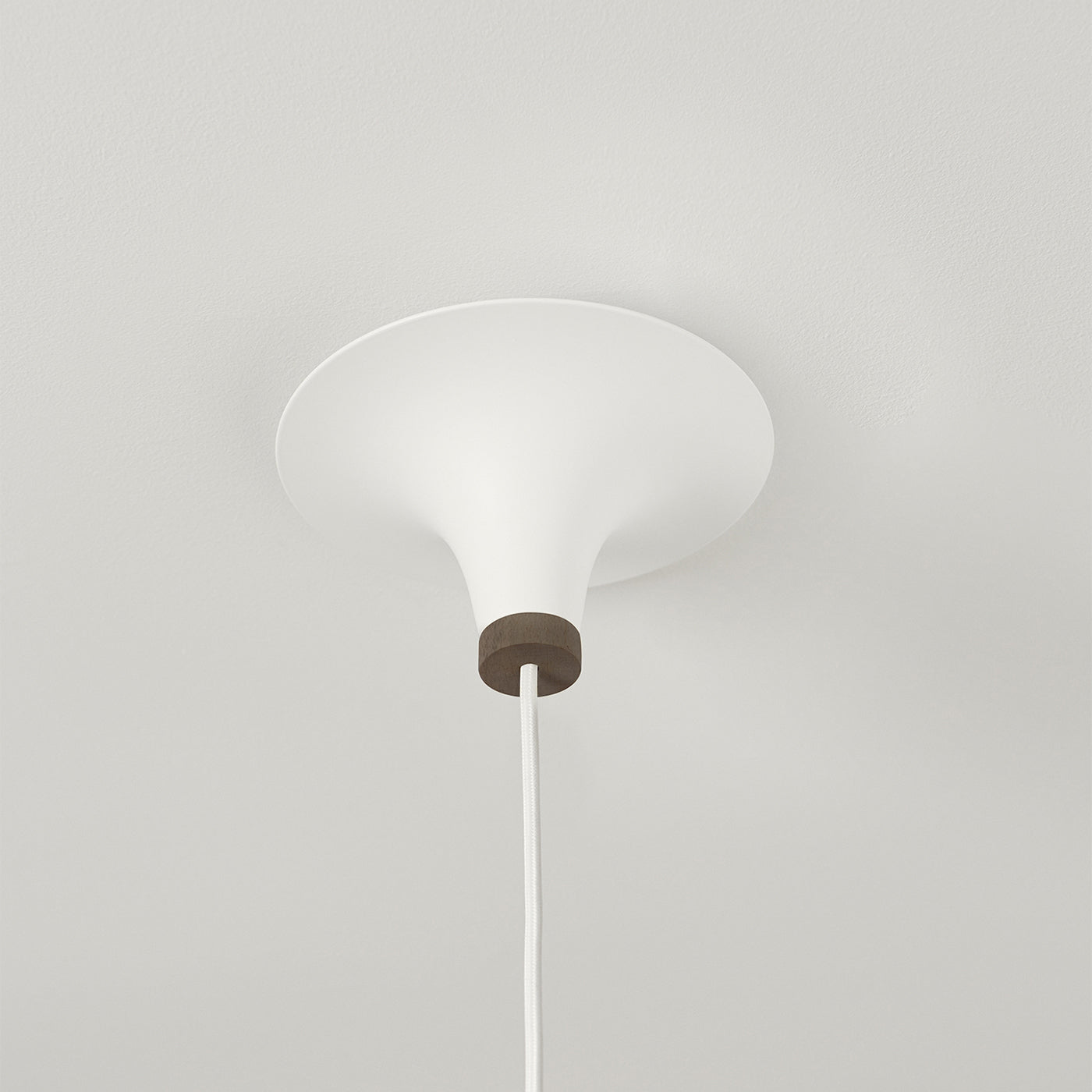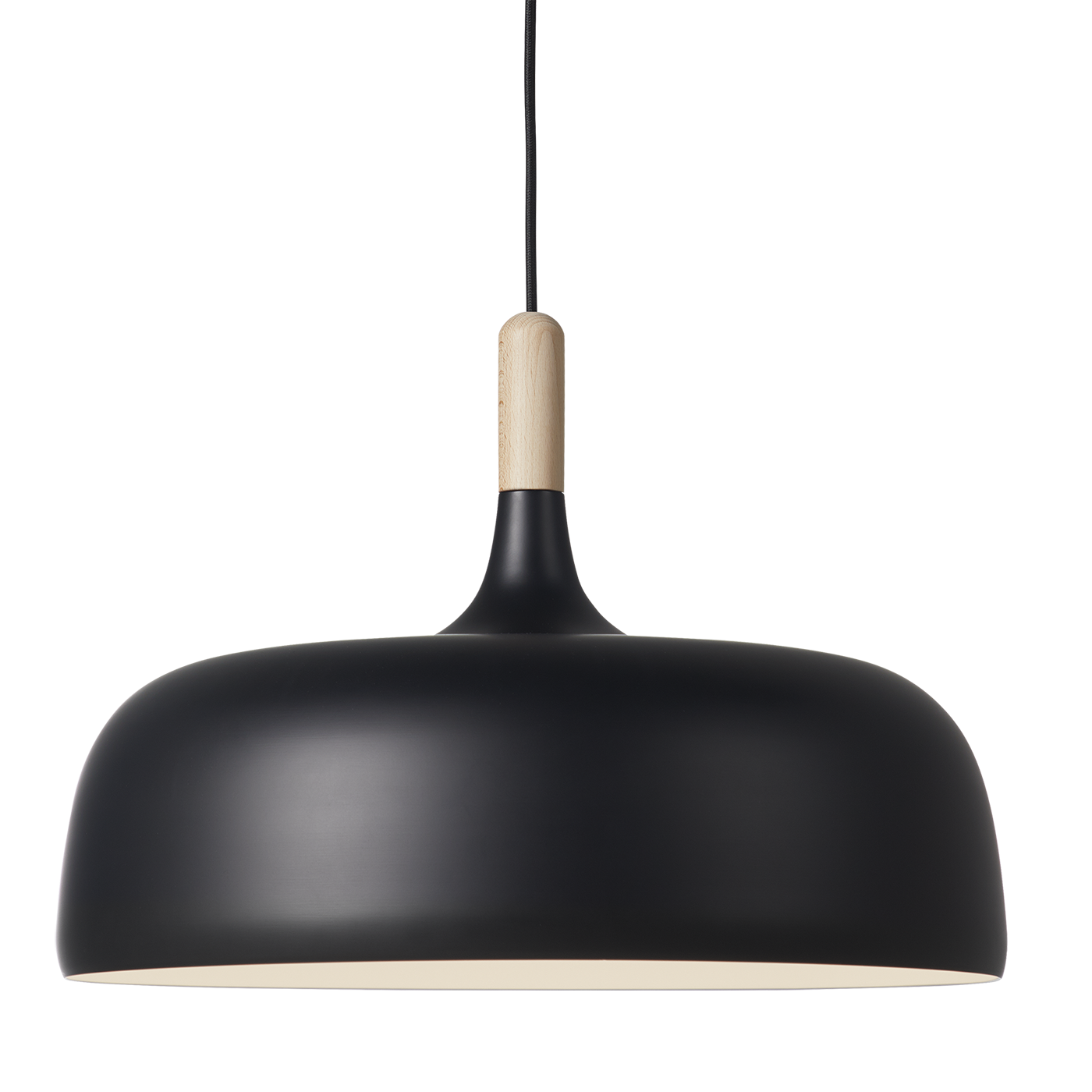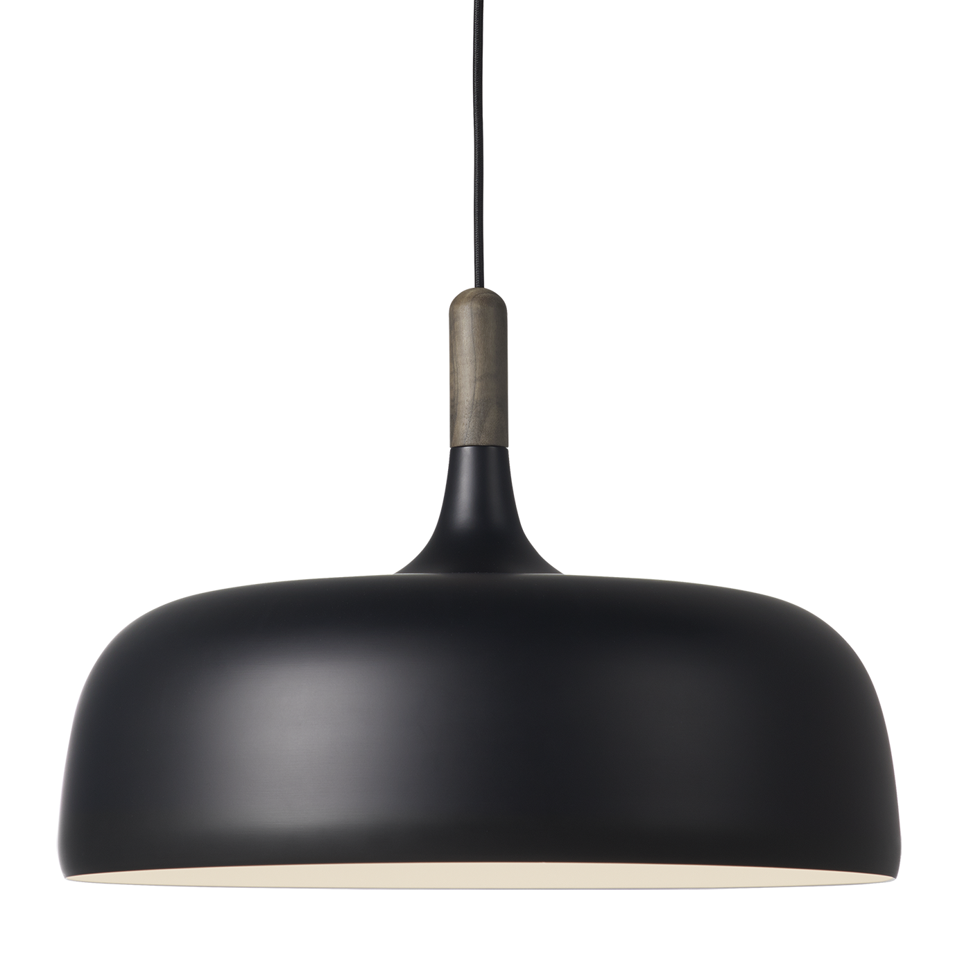 Acorns form er inspirert av en naturlig form. Skjermen ligner det tomme skallet fra en eikenøtt, som blir hul når den modne nøtten har brutt seg fri. Som en eikenøttstamme, smalner toppen av skyggen til en taktil form. Strømlinjeformet og sofistikert, er lampen hengt opp fra taket i en silkekabel som skjuler strømkabelen inni den. Lampen festes til taket med en himlingshylse laget i samme stil som skjermen. Denne pendellampen tilhører en ny serie design som gjenskaper naturens skjønnhet i et funksjonelt objekt. Lampen er laget i aluminium og bøk eller valnøtt, og malt enten hvit eller grå. Lampen kombinerer naturlige materialer med upretensiøse farger. Den matt svarte versjonen fremhever Acorns særegne form og skaper større kontrast med omgivelsene. Acorn er et naturlig supplement til moderne interiør, og en flott måte å skinne lys over bordplater, pulter og arbeidsflater. |