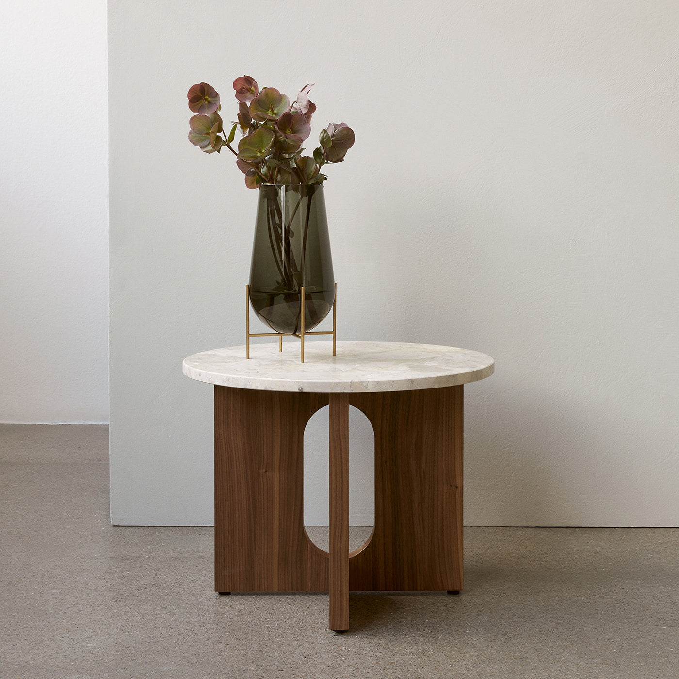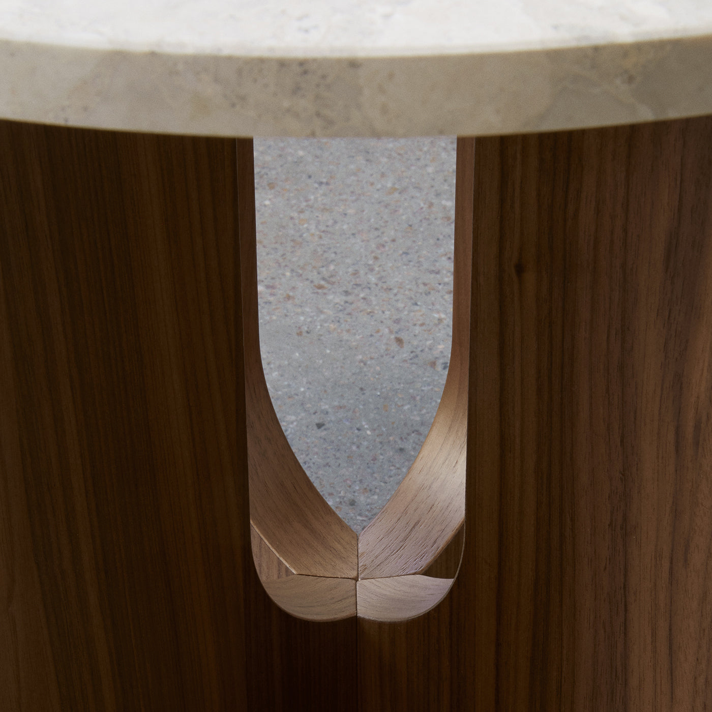 Et vakkert og praktisk sidebord som gjør smart bruk av håndverk og taktile materialer, det enkle silhouetten av Androgyne er preget av motsetninger. Den rene materialbruken står i kontrast til en raffinert silhuett av solide og myke linjer, som lever opp til navnet takket være til dens kombinasjon av maskuline og feminine egenskaper. Sammensetningen av rik eik – med en naturlig eller mørk beiset finish – valnøtt og Kunis Breccia-stein skaper et særegent design kan tilpasses til enhver interiørstil.