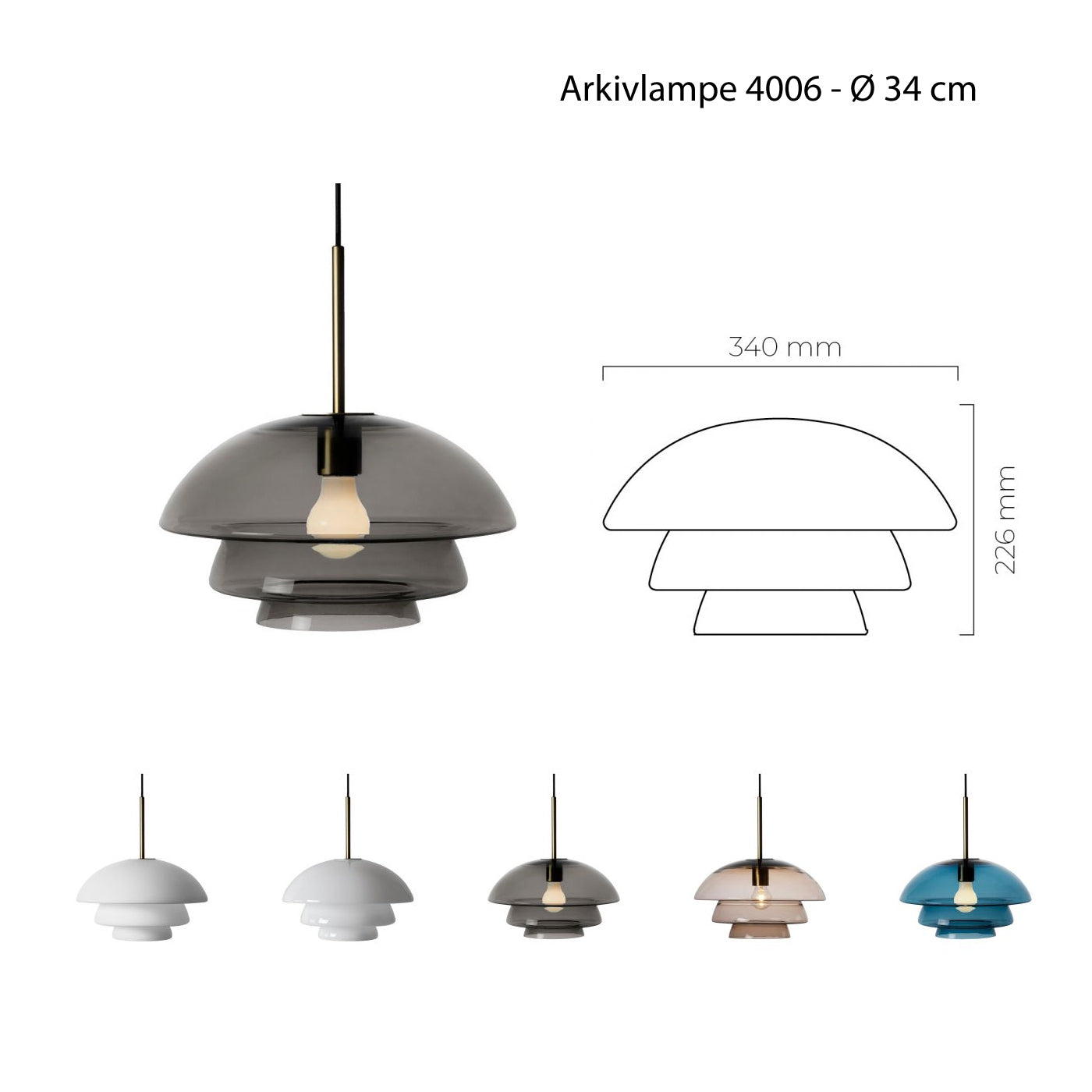 Produktbeskrivelse: Arkivlampe 4006 er den eldste formen fra 1932, og samtidig den mest ikoniske med sin unike form.Hele produksjonen av arkivlampene foregår på Hadeland Glassverk. Treformen som glassmassen blir blåst ned i, dreies ut av formsnekkeren. Lampen munnblåses med de samme gamle teknikkene som ble brukt for mer enn 250 år siden, og avkjøles i alt fra 4 timer til flere dager avhengig av tykkelsen på glasset. Deretter blir den grovslipt, finslipt og polert av sliperne. |