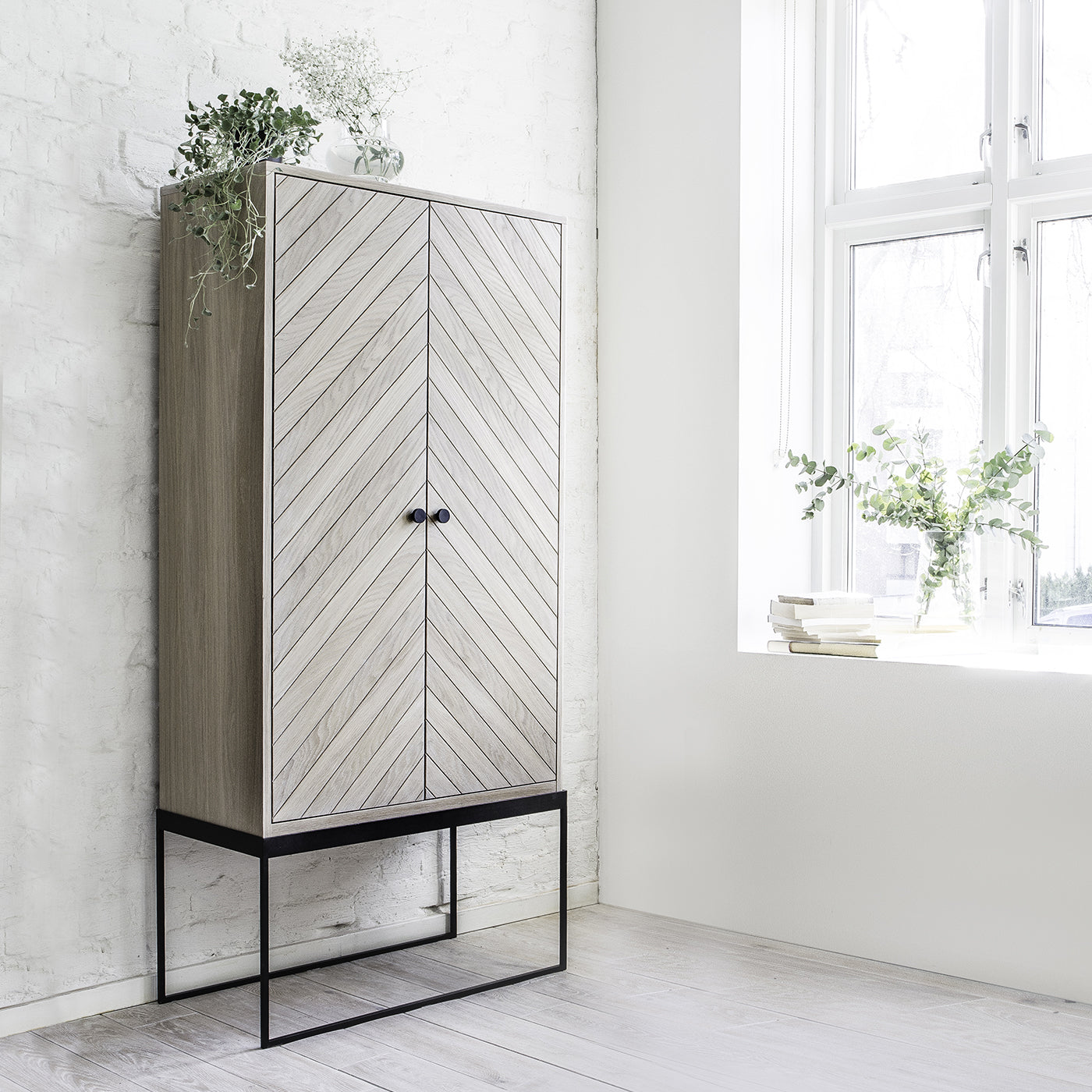 Dis-skapet er kombinasjon av overdimensjonering og minimalisme i en kraftig motsetning. Solidt håndverk og ærlige eikematerialer kompletteres av en rustfritt stålramme. Velg mellom vanlige dører; vakker i sin nordiske enkelhet, eller fiskebeinsmønster på dører som gir et særegent og sofistikert uttrykk. |