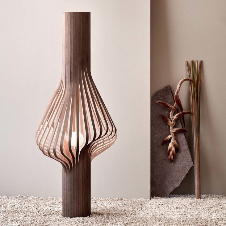 Divas særegne, spiralformede skygge skaper en skulpturell form som kan verdsettes fra flere utsiktspunkter. Laget av 32 strimler av laminert kryssfiner, viser lampen de sofistikerte teknikkene som kreves for å lage en slik uttrykksfull form. Pendellampen gir et slående trekk i interiøret mens det mykt sprer lys over rommet. Nylig redesignet i en slankere stil, balanserer gulvlampen skyggen på en skinnende metallskive som sitter i flukt med overflaten. |