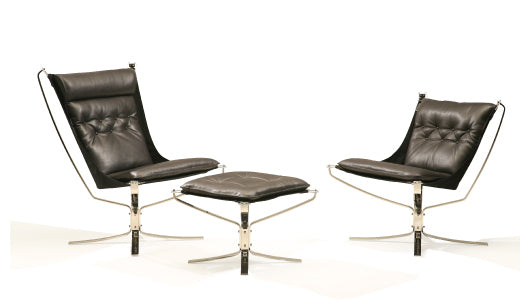 Møbel ikonet Falcon er satt i produksjon igjen. Den elegante og tidløse stolen er tilgjenglig med pute i skinn eller tekstil, kanvas i sort stoff og understell i forkrommet eller matt svartlakkert stål. Den produseres som lav og høy stol, med eller uten taburett. "Falcon First" betegner knappene i puten og "Falcon Phoenix" erstatter knapper med horisontal midtsøm. Kom innom Pur Norsk og prøvesitt et stykke norsk møbelhistorie. |