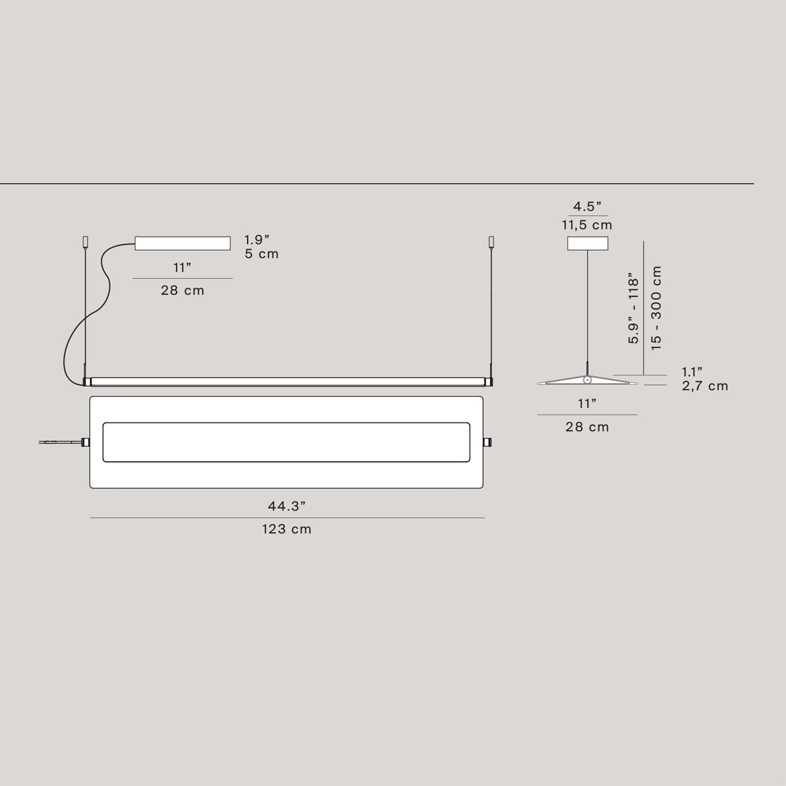Materialer: Anodisert aluminium og polykabonat difuser Dimmensjoner: 123 cm x 28 cm Overflate farge: Mørkegrå eller hvit Difuser farge: Opal Lyskilde: LED 53W - 2700K, CRI 90 |