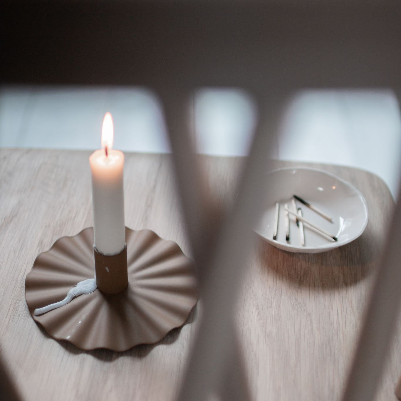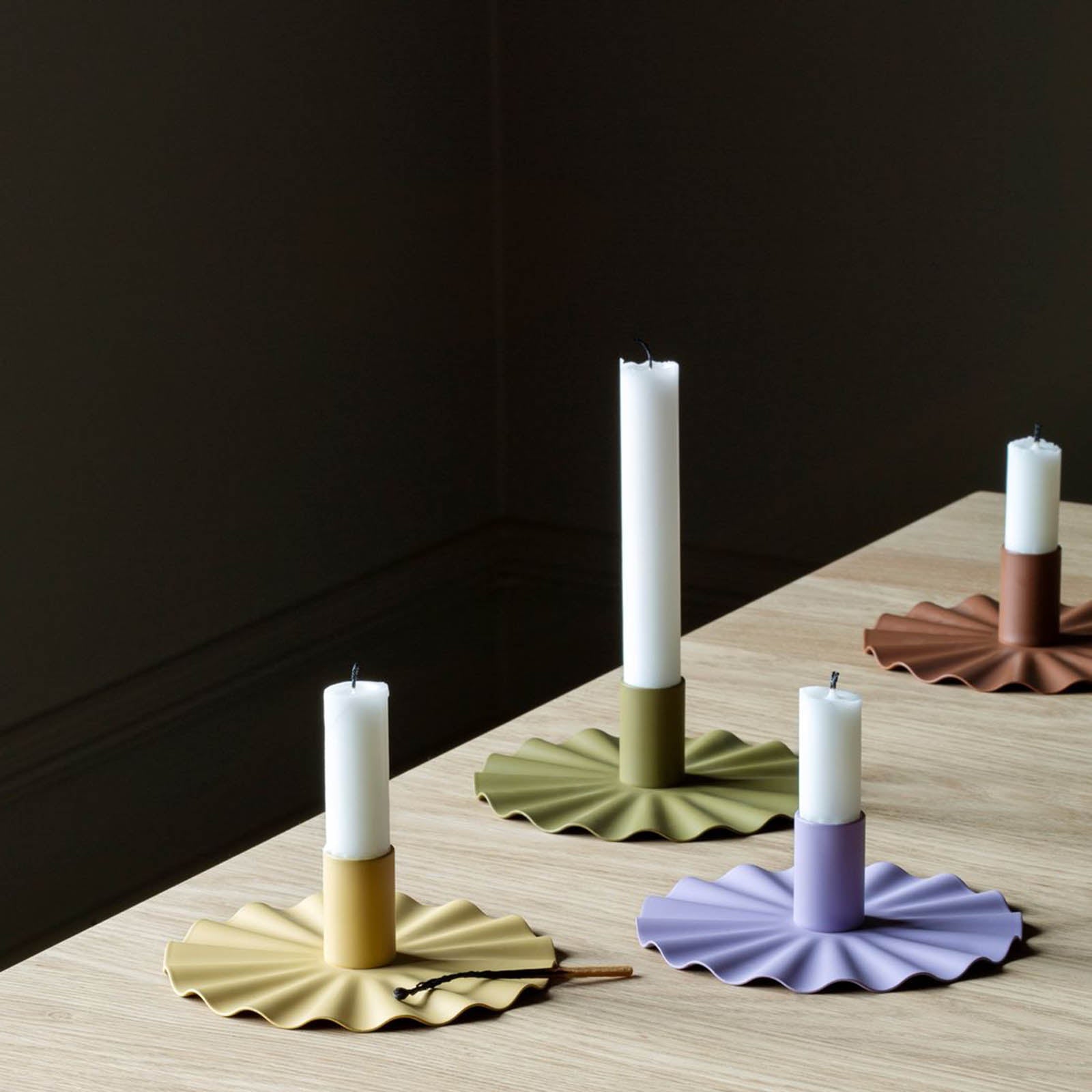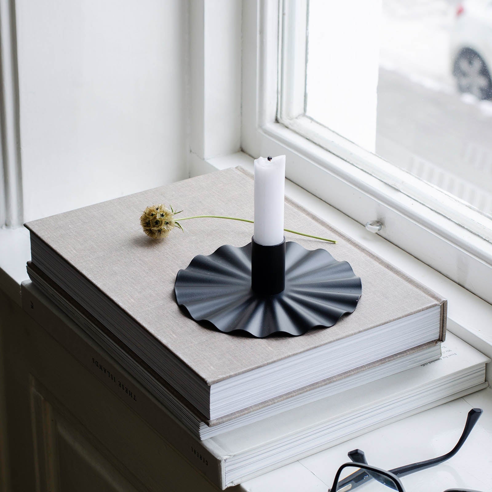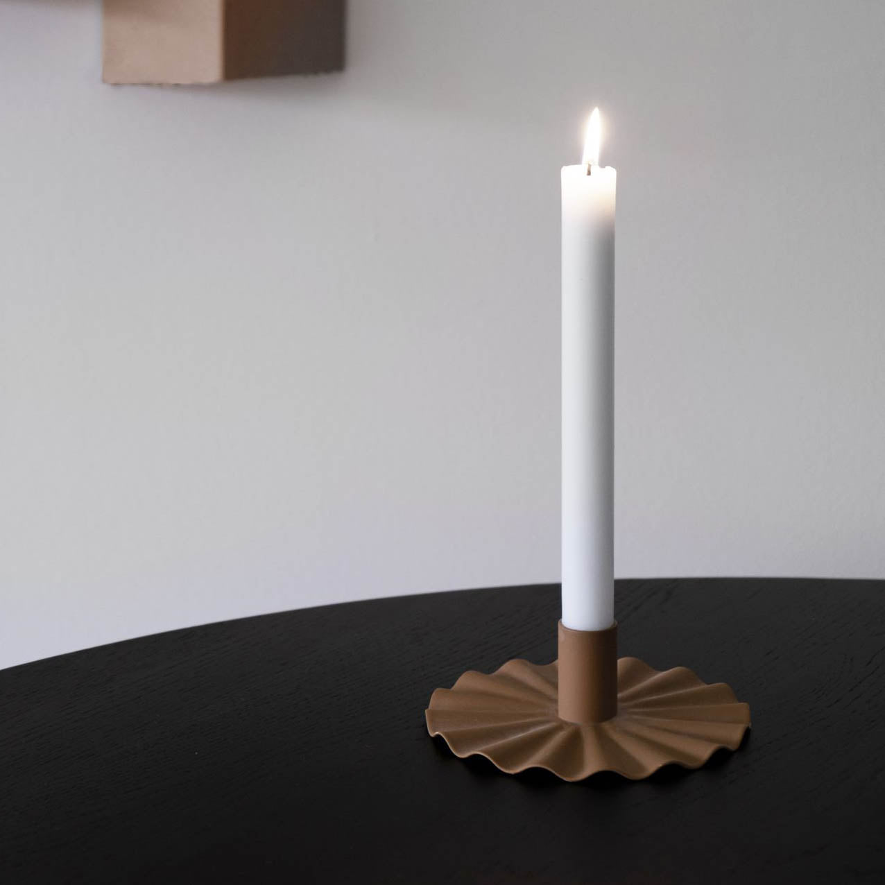 Krumning i vann, sand og bølger var blant designerens inspirasjonskilder til Krum-lysestaken. Med sin flate, bølgete form i lakkert metall er det en moderne tolkning av lysestaken. |