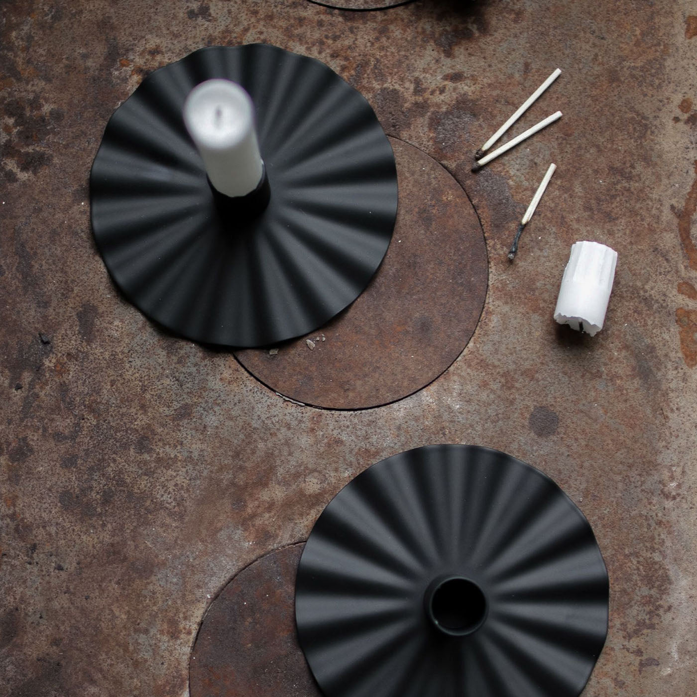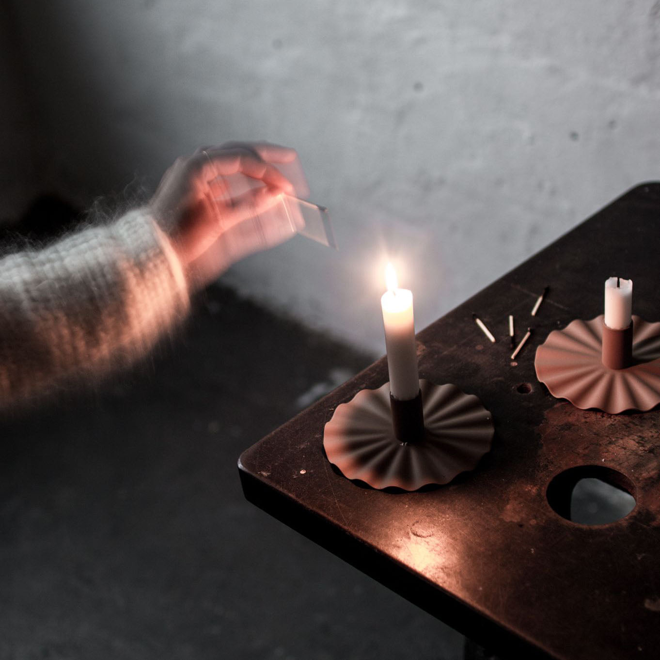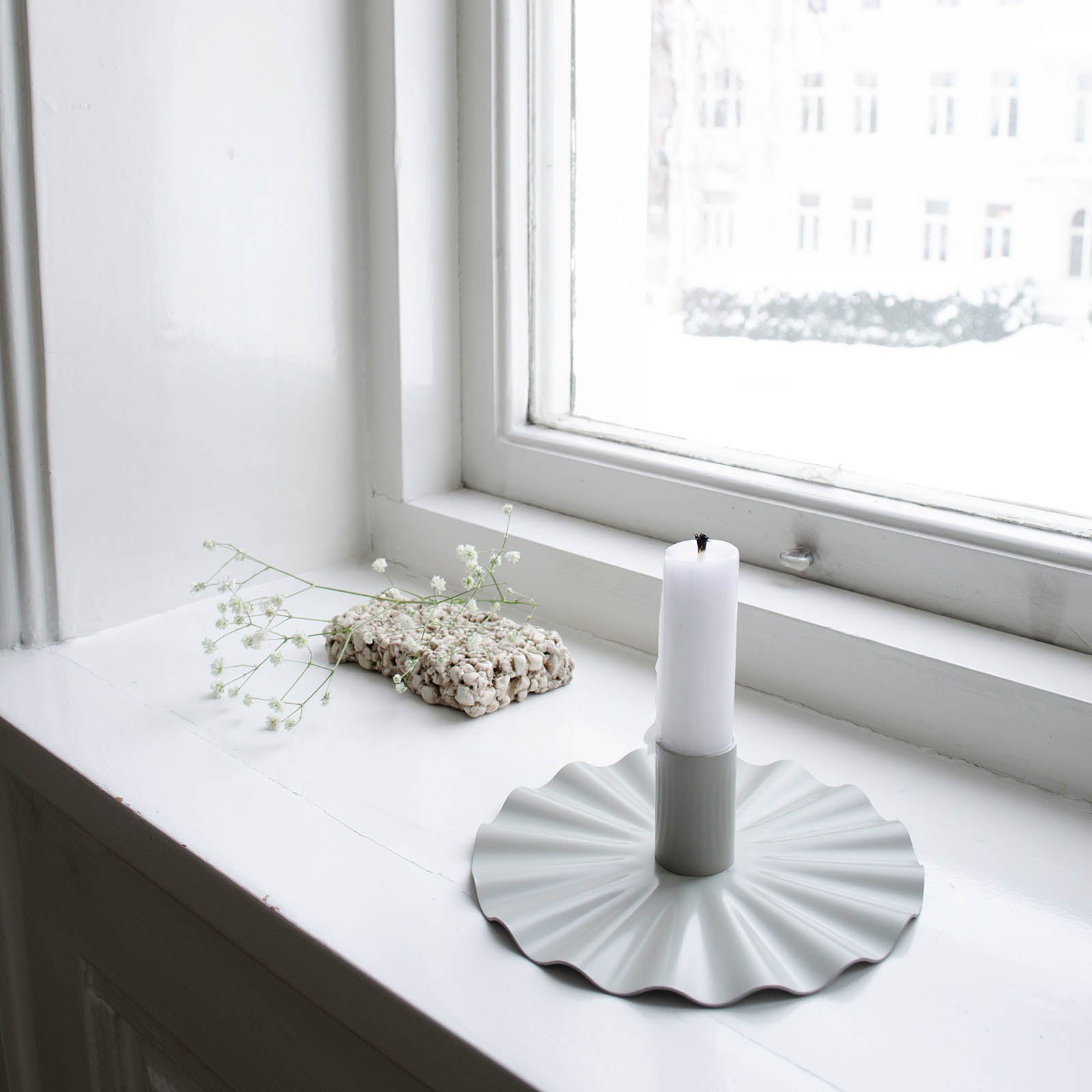 Krumning i vann, sand og bølger var blant designerens inspirasjonskilder til Krum-lysestaken. Med sin flate, bølgete form i lakkert metall er det en moderne tolkning av lysestaken. |