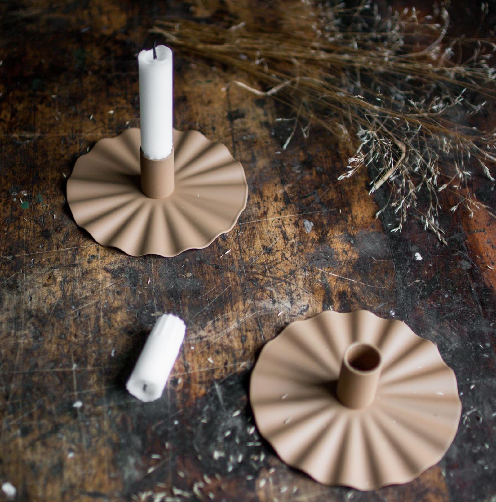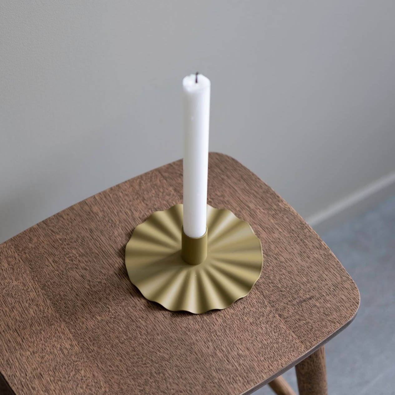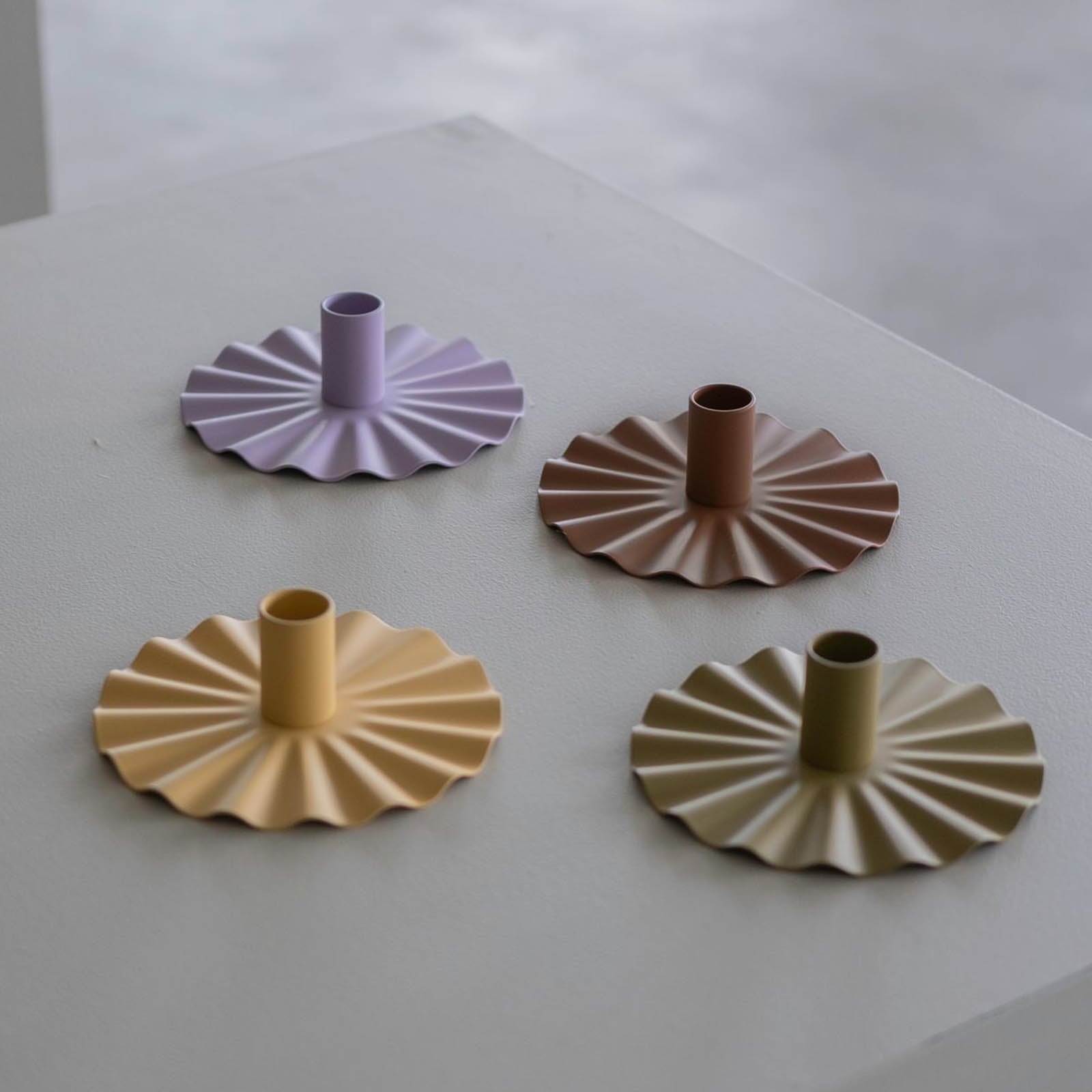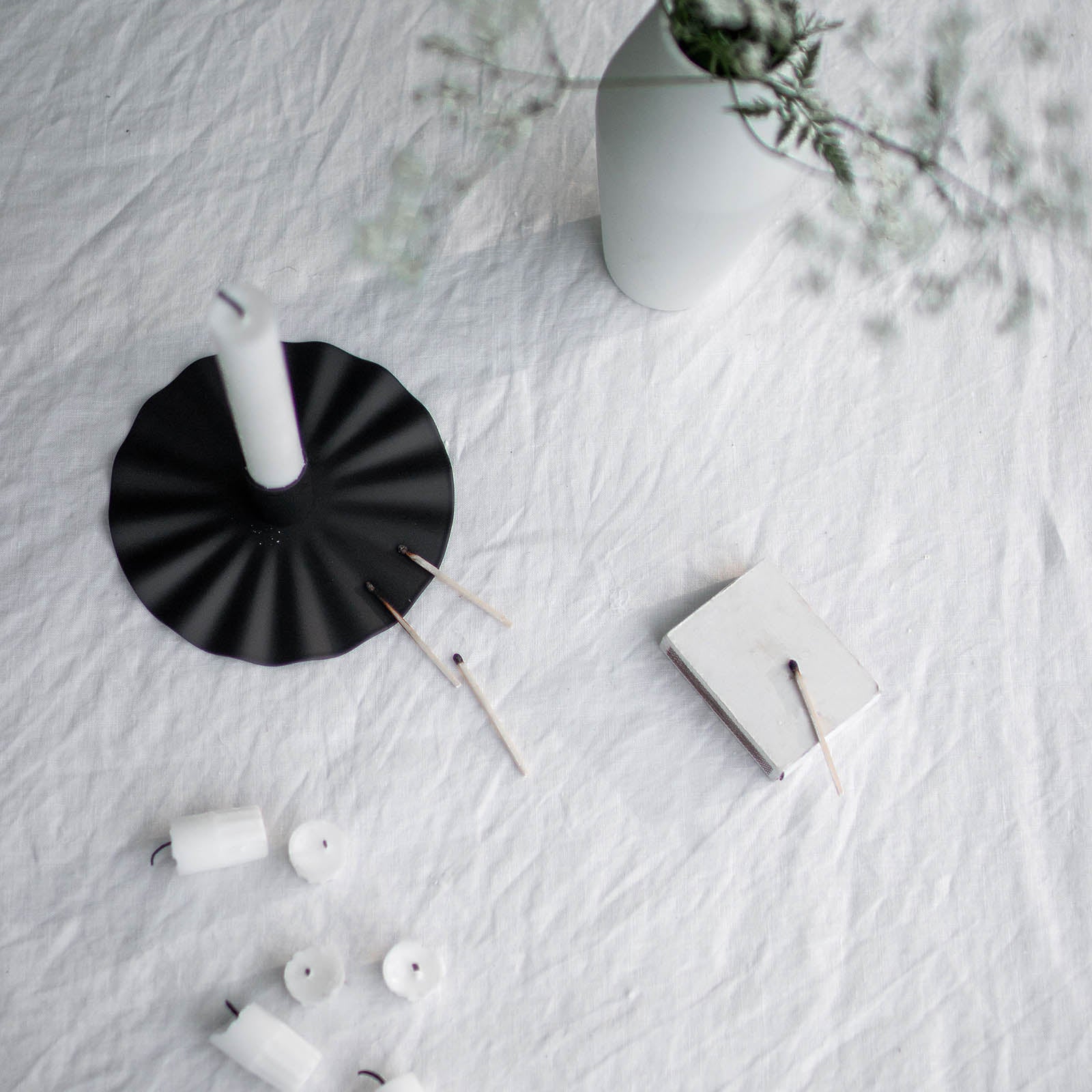 Krumning i vann, sand og bølger var blant designerens inspirasjonskilder til Krum-lysestaken. Med sin flate, bølgete form i lakkert metall er det en moderne tolkning av lysestaken. |