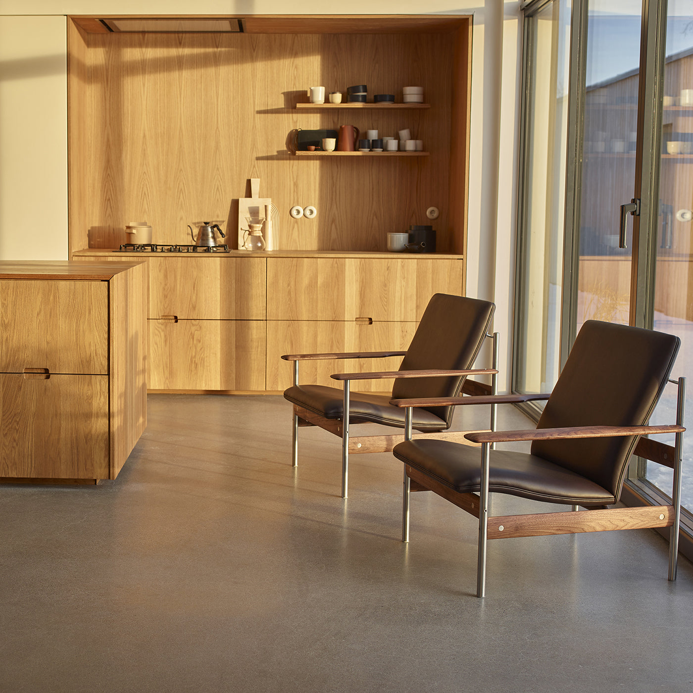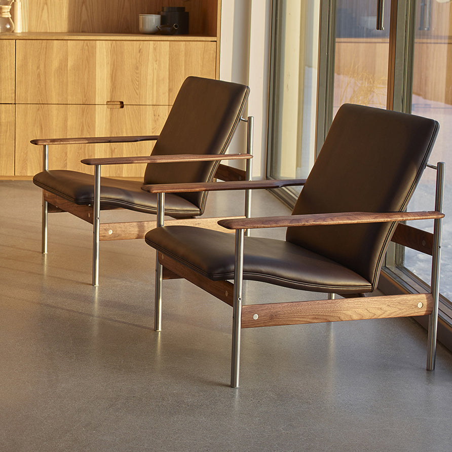 Lenestol Model 1001 designet av Sven Ivar Dysthe i 1959. Dennee ikoniske lenestolen løftet Dysthe til et internasjonalt designnivå og han vant "The American Institute of Decorations International Award Litation". AF - Versjonen har vanlig polstring og en solid valnøtt- og rustfritt stålunderlag. |
