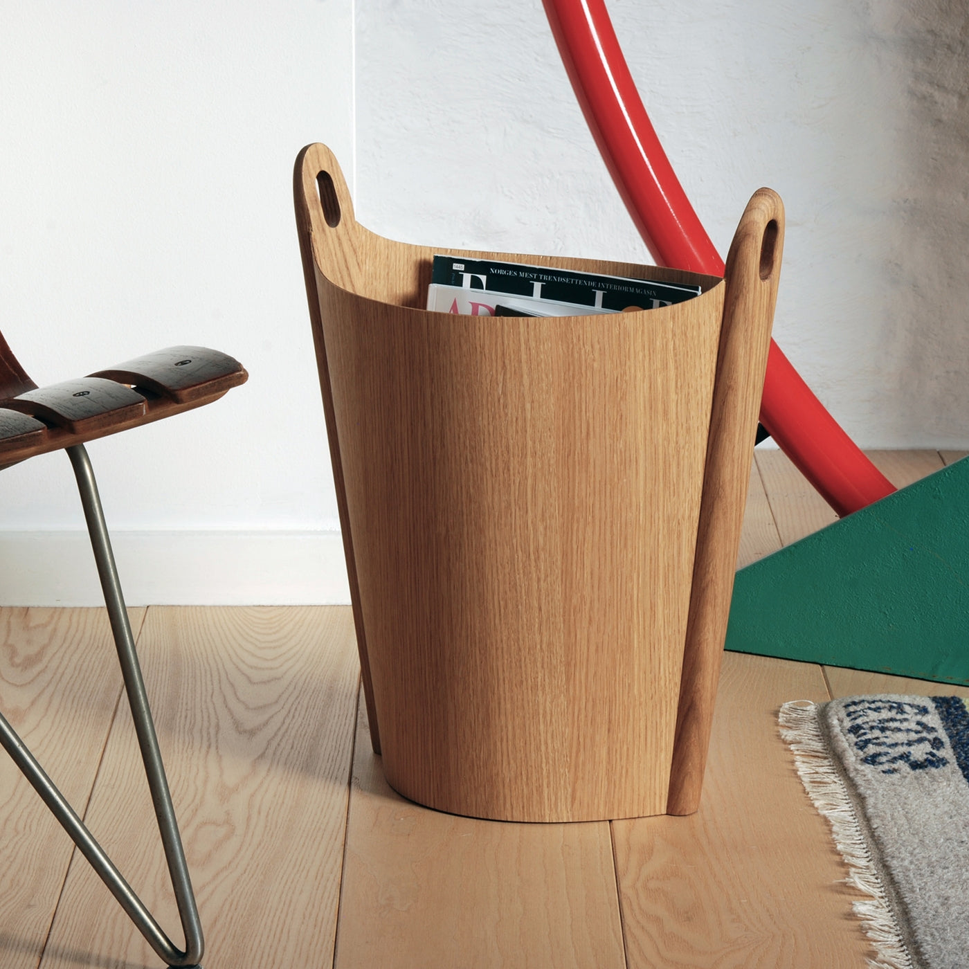 Oval kan benyttes som aviskurv i stuen eller en elegant papirkurv til kontoret. Produseres i oljet eik og valnøtt. |