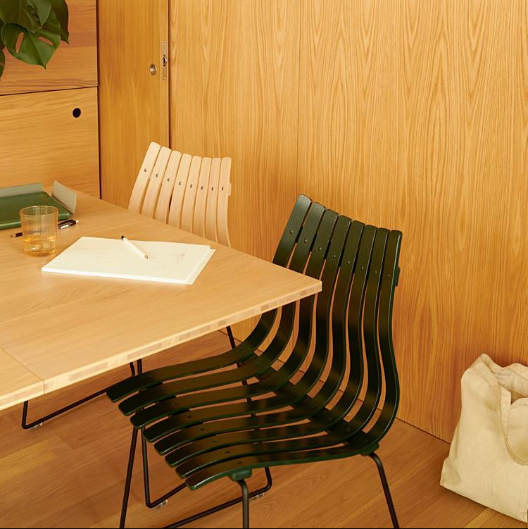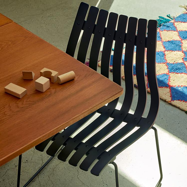 Scandia Junior er en stilren spisestuestol, produsert i laminert, lakkert eik eller valnøtt, og kan også leveres i gjennomfarget finer med lyse kanter. Understellet leveres i satin-krom eller sort stål, og stolen produseres med stolthet i vår egen fabrikk i Norge.