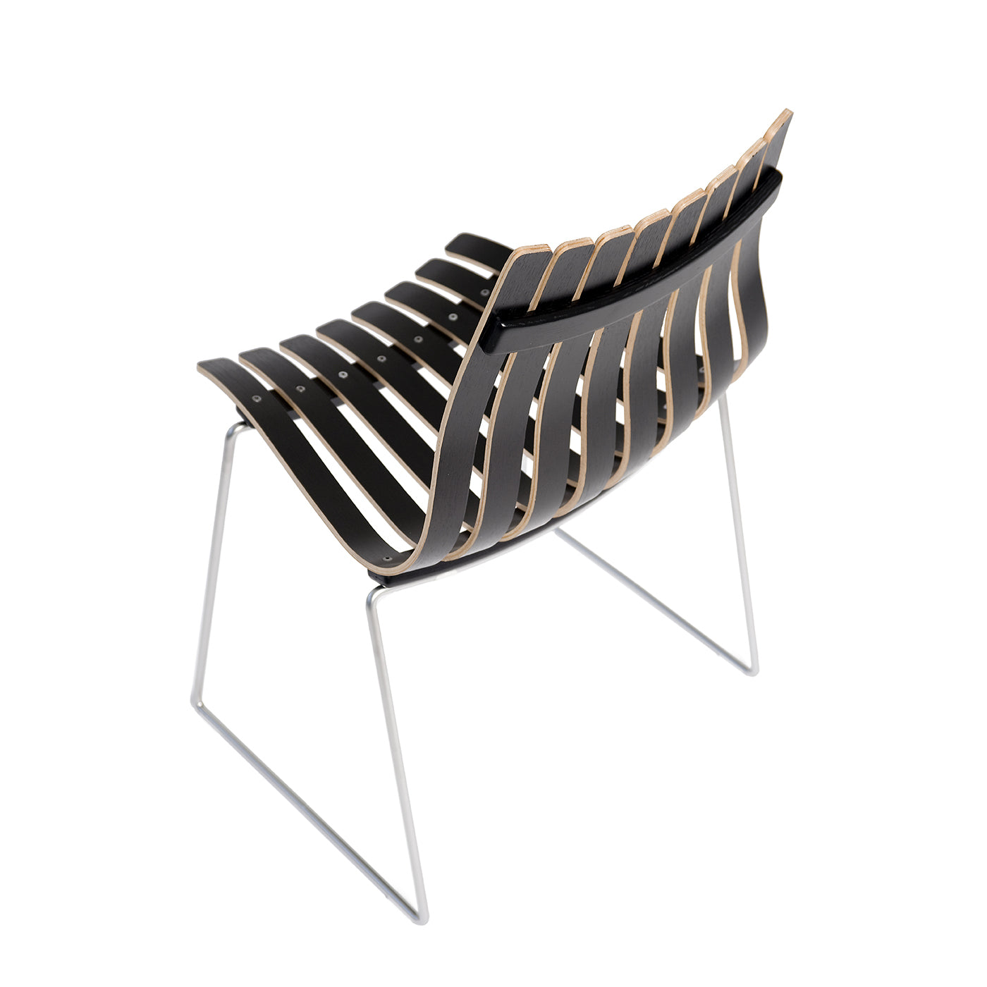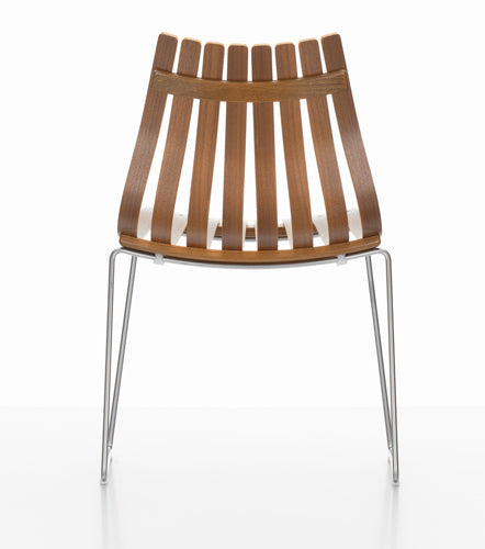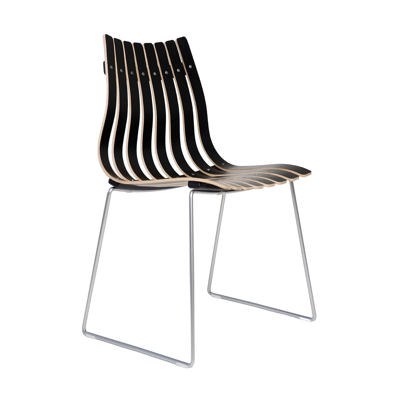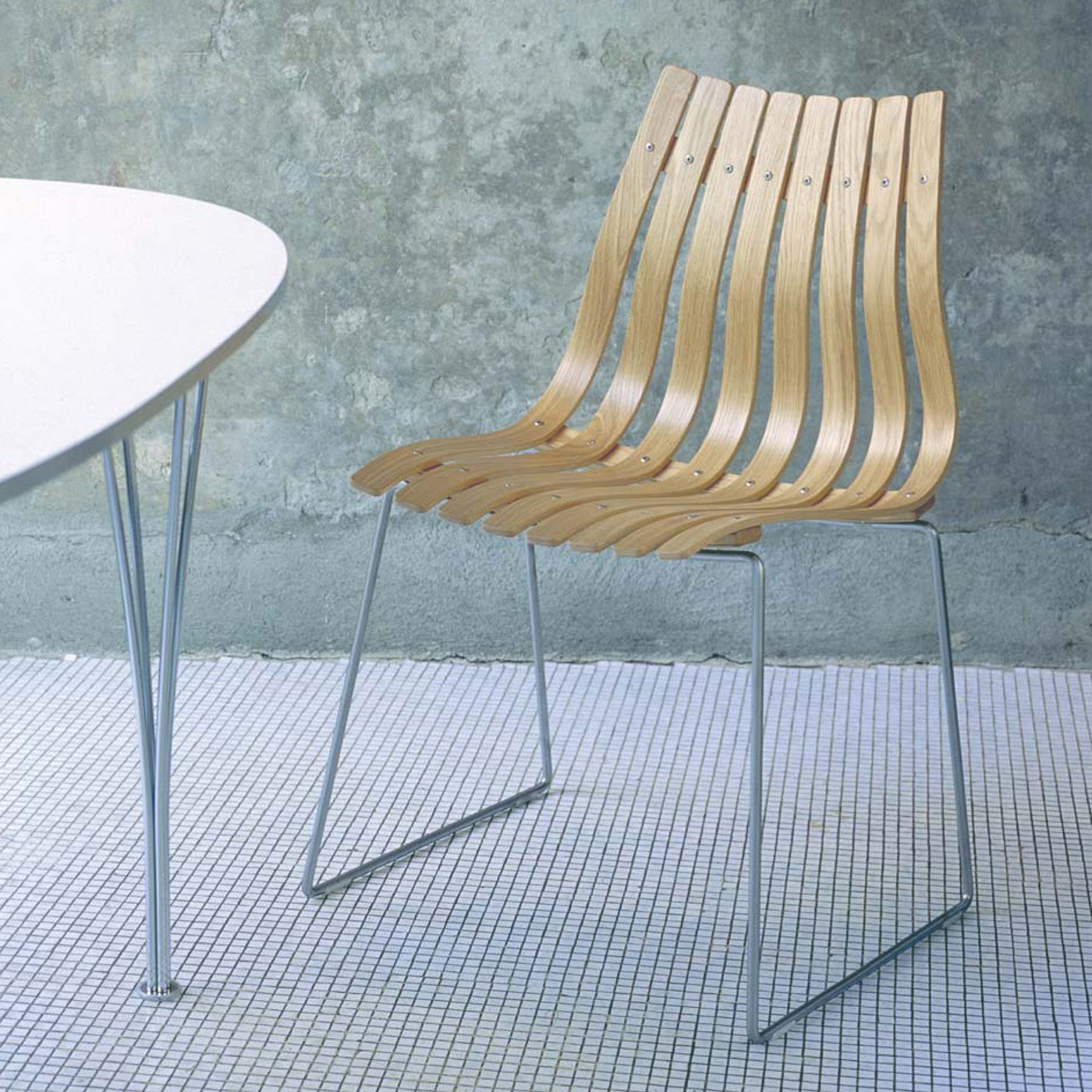 Scandia Junior spisestol i laminert amerikansk valnøtt eller amerikansk eik. Treverket er lakkert og understellet i matt krom bolt understell. |