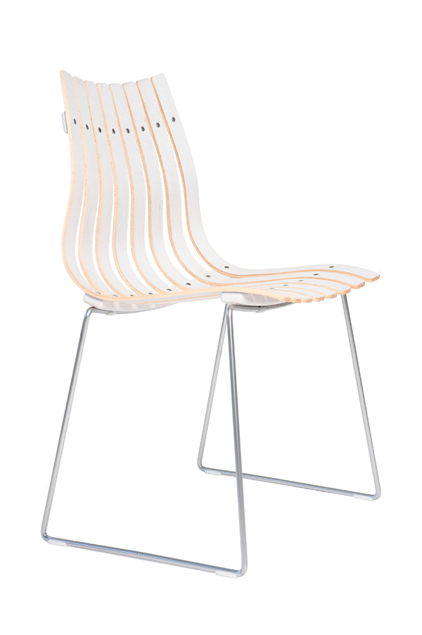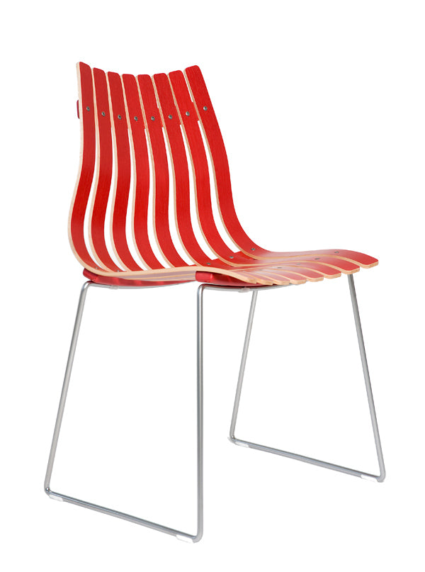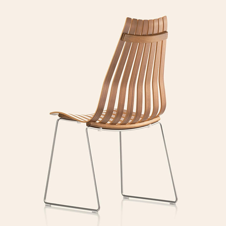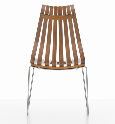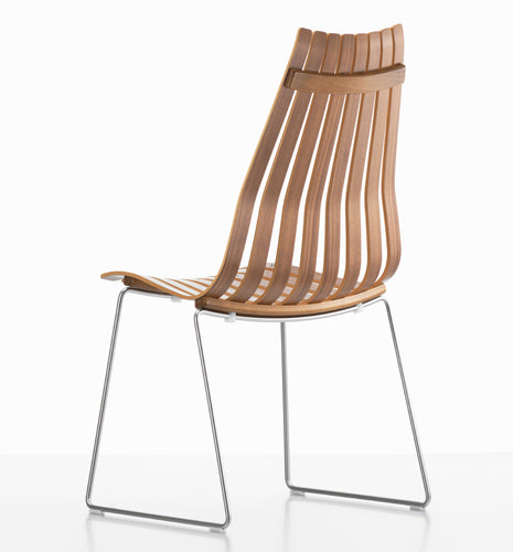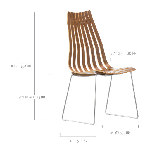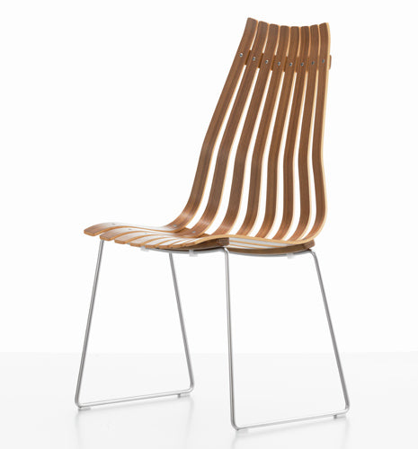 Scandia Junior spisestol i laminert amerikansk valnøtt eller amerikansk eik. Treverket er lakkert og understellet i matt krom bolt understell. Dimensjoner: Høyde rygg 950 mm Bredde 540 mm Dybde 510 mm Setehøyde: 420 mm |