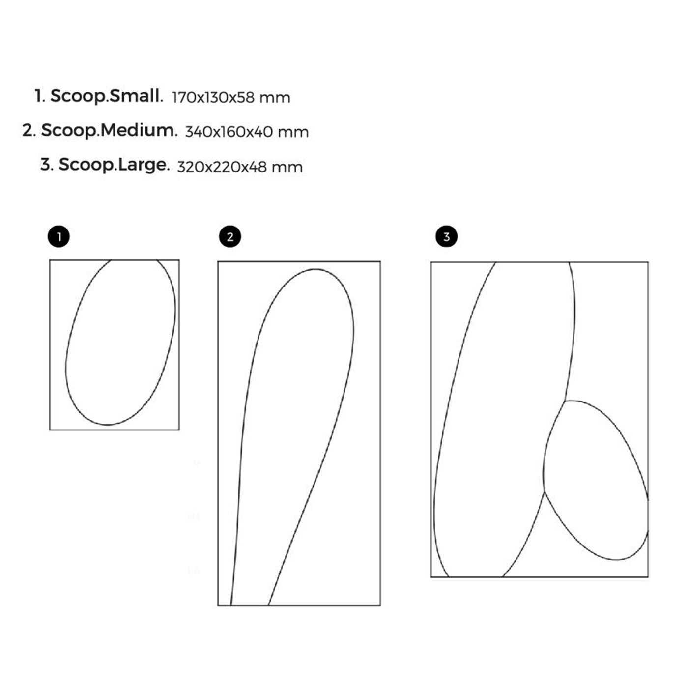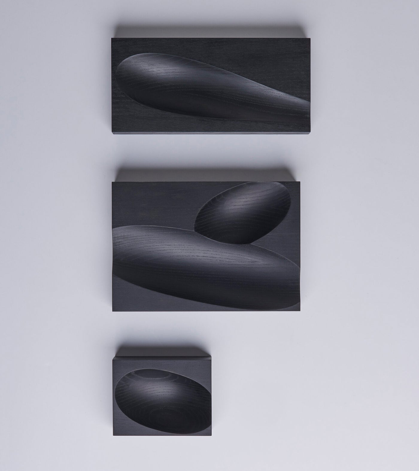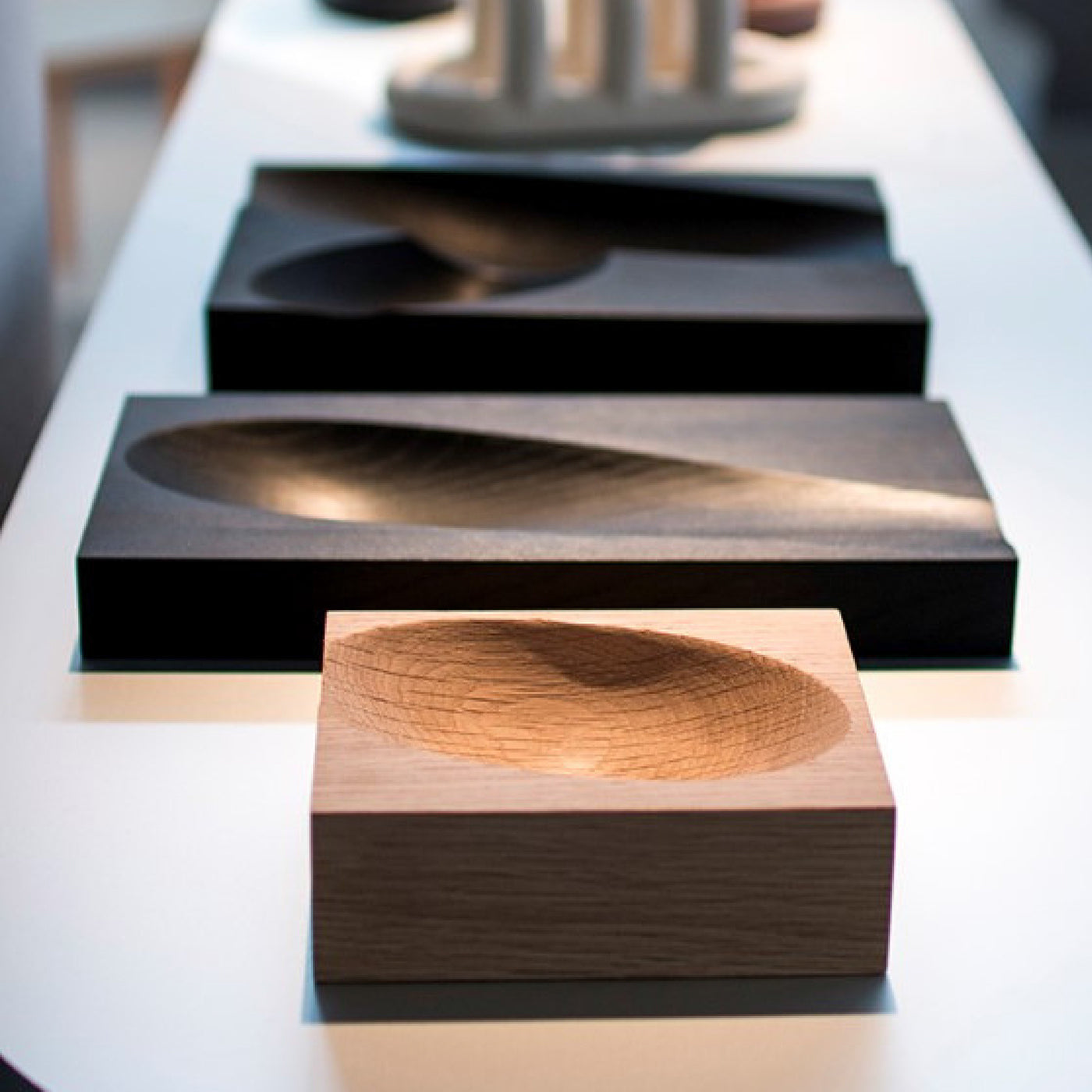 En familie av tre flerbruks boller som kan brukes til å samle eller å stille ut små objekter eller som en dekorasjon i seg selv. Håndskåret ut med tradisjonelle verktøy fra en rektangulær planke. Finnes i forskjellige materialer og overflatebehandlinger. |
