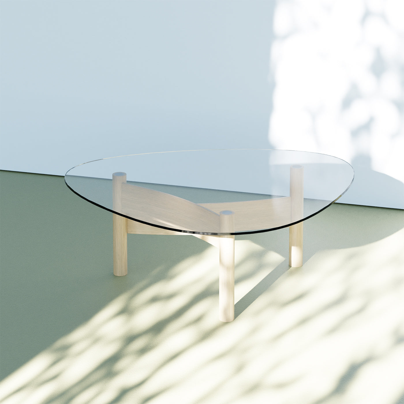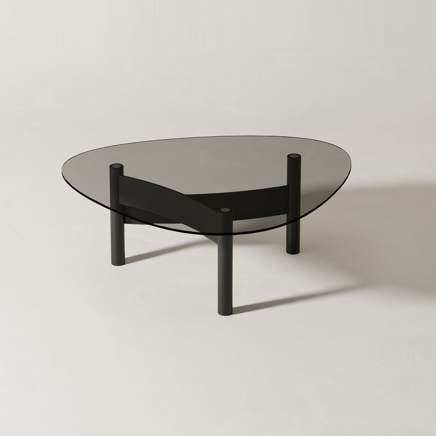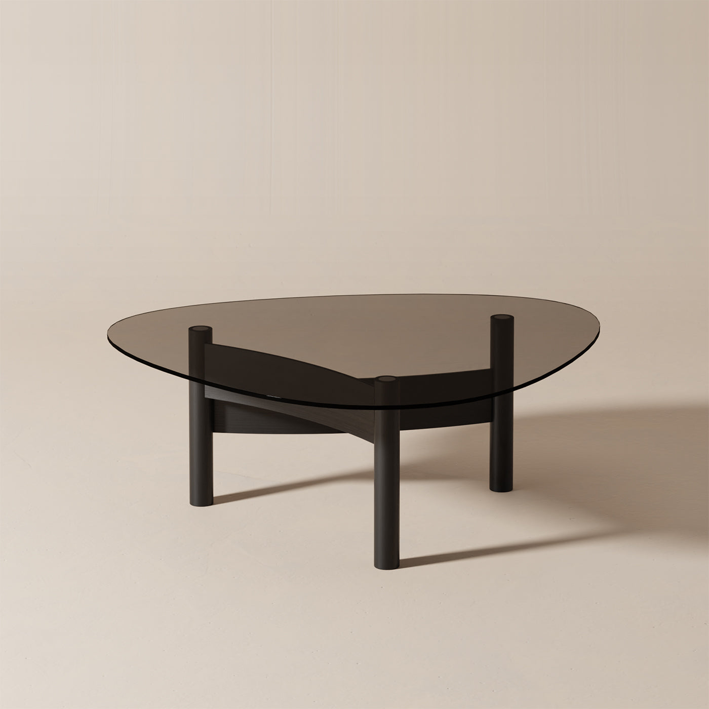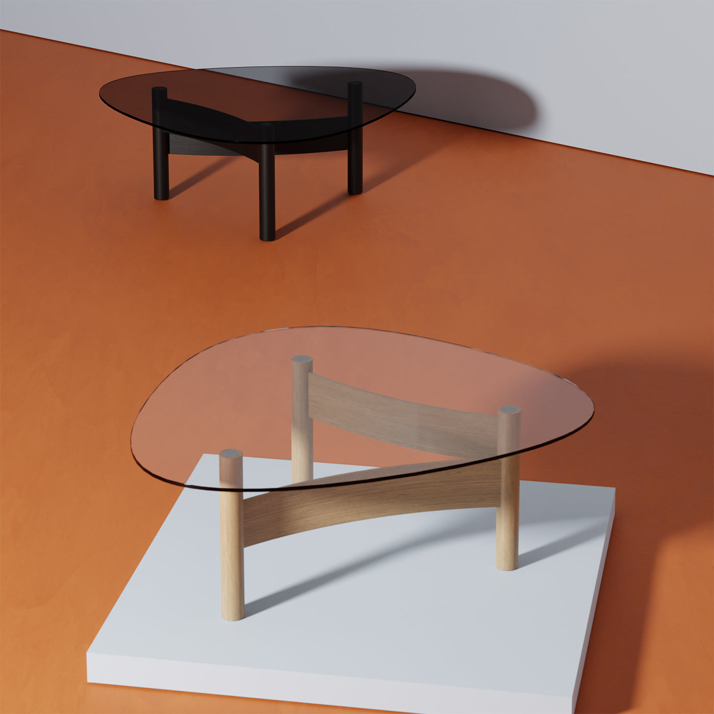 Overflater: Bordplate i røkt glass og ben i sortlakkert eik. Bordplate i klart glass og ben i lakkert eik. |