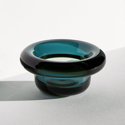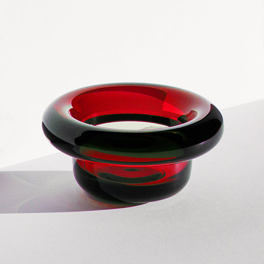 Sirkel er en telysholder i farget glass. Fargeintensiteten skifter med materialets tykkelse, og gir inntrykk av en solid ring av tettere farge. |