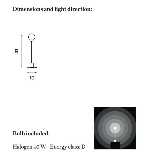 Bord- og gulvlampeserie Skjermmateriale: Munnblåst glass Skjermfarge: Hvitt opalt glass Lampefot materiale: Stål og aluminium eller messing Kroppsfarge: stål, hvit, svart eller børstet messing Pære: G9 Halogen. Maks. 40 W |
