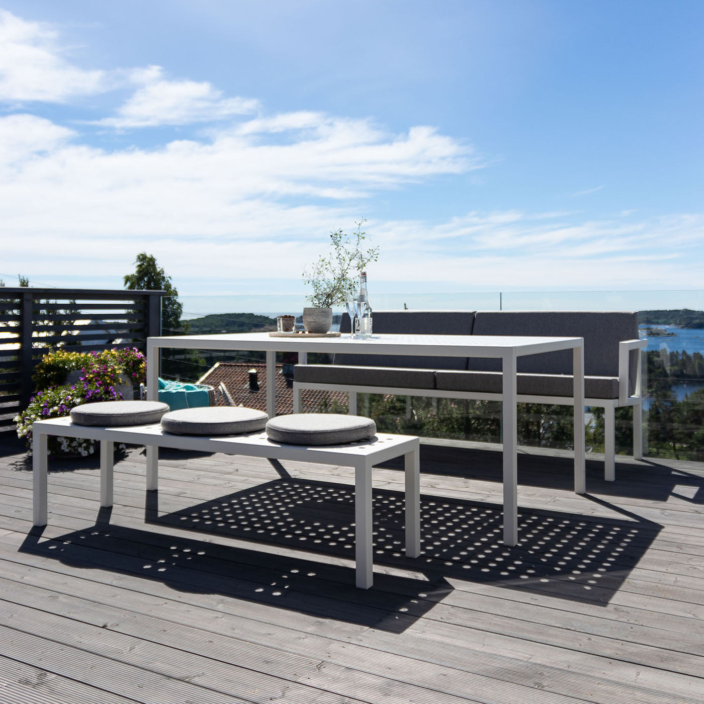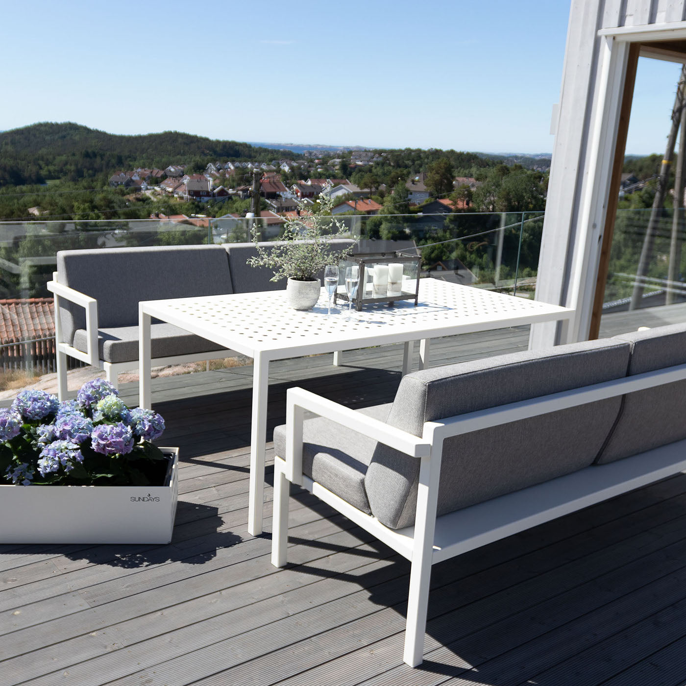Enkle linjer designet i evigvarende materialer. Hver eneste strek er lagt med tanke på hvor vannet skal renne av. Med sitt minimalisiste utrykk, gjør designet seg godt i vågale farger og tekstilvalg. Møblene er laget i pulverlakkert aluminium og ruster ikke. Putene tåler selvfølgelig både regne og snø. Sundays design er hardhausen av designmøbler. Med Sundays kan du starte sommersesongen allerede i påsken, og la terrassen på hytta eller hjemme gi deg et hint av sommer midt i skisesongen. |