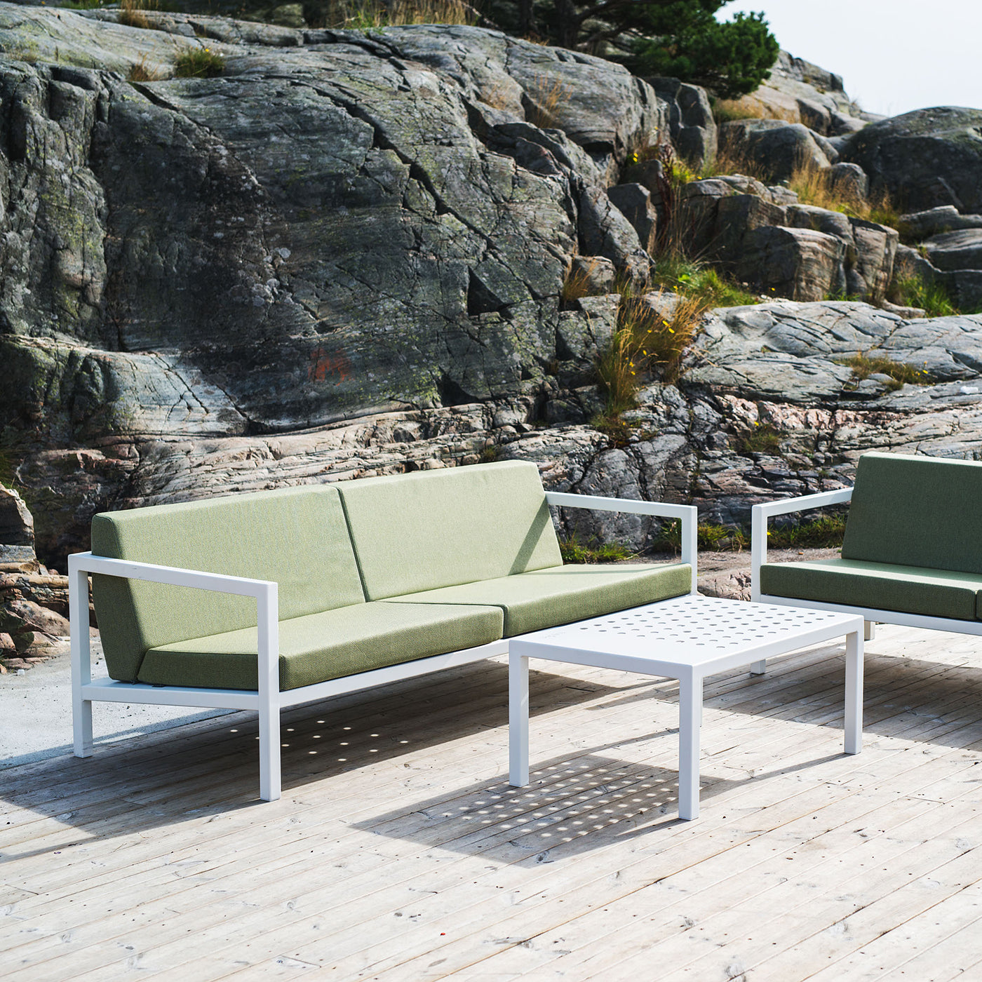 Materiale: Ramme: Aluminium Alle våre puter kan stå ute igjennom hele sesongen i typisk norsk sommervær! Vi bruker vann drenerende skum og vannavstøtende tekstiler for at putene skal tørke raskt etter regnskyll. Etter regn kommer sol! |