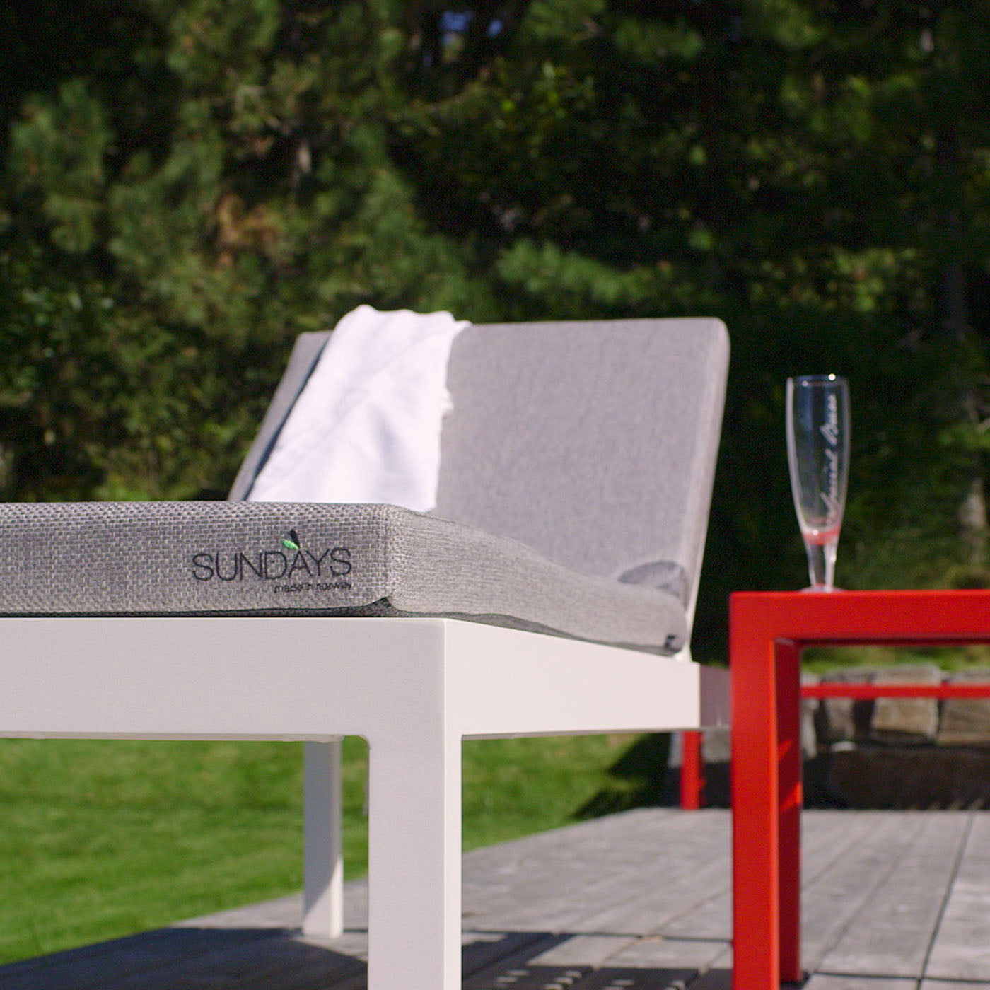 Enkle linjer designet i evigvarende materialer. Hver eneste strek er lagt med tanke på hvor vannet skal renne av. Med sitt minimalisiste utrykk, gjør designet seg godt i vågale farger og tekstilvalg. Møblene er laget i pulverlakkert aluminium og ruster ikke. Putene tåler selvfølgelig både regne og snø. Sundays design er hardhausen av designmøbler. Med våre møbler kan du starte sommersesongen allerede i påsken, og la terrassen på hytta eller hjemme gi deg et hint av sommer midt i skisesongen. |
