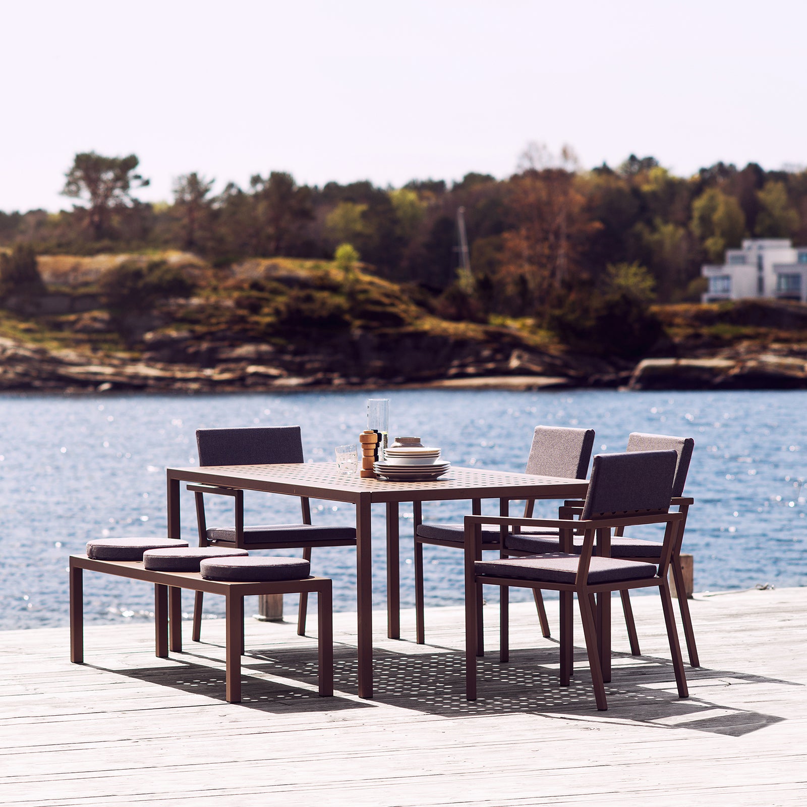 Enkle linjer designet i evigvarende materialer. Hver eneste strek er lagt med tanke på hvor vannet skal renne av. Med sitt minimalisiste utrykk, gjør designet seg godt i vågale farger og tekstilvalg. Møblene er laget i pulverlakkert aluminium og ruster ikke. Putene tåler selvfølgelig både regne og snø. Sundays design er hardhausen av designmøbler. Med Sundays kan du starte sommersesongen allerede i påsken, og la terrassen på hytta eller hjemme gi deg et hint av sommer midt i skisesongen. |