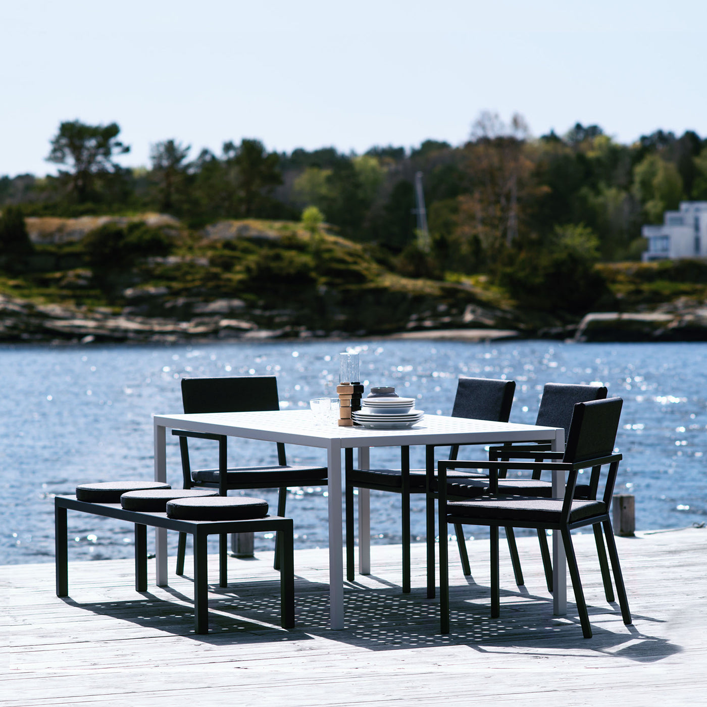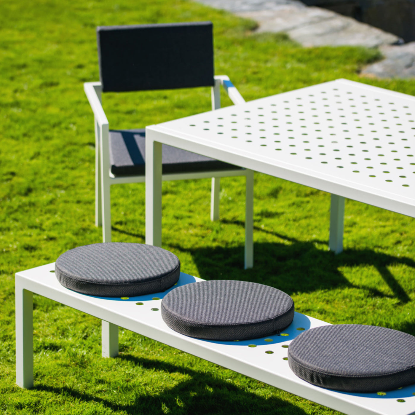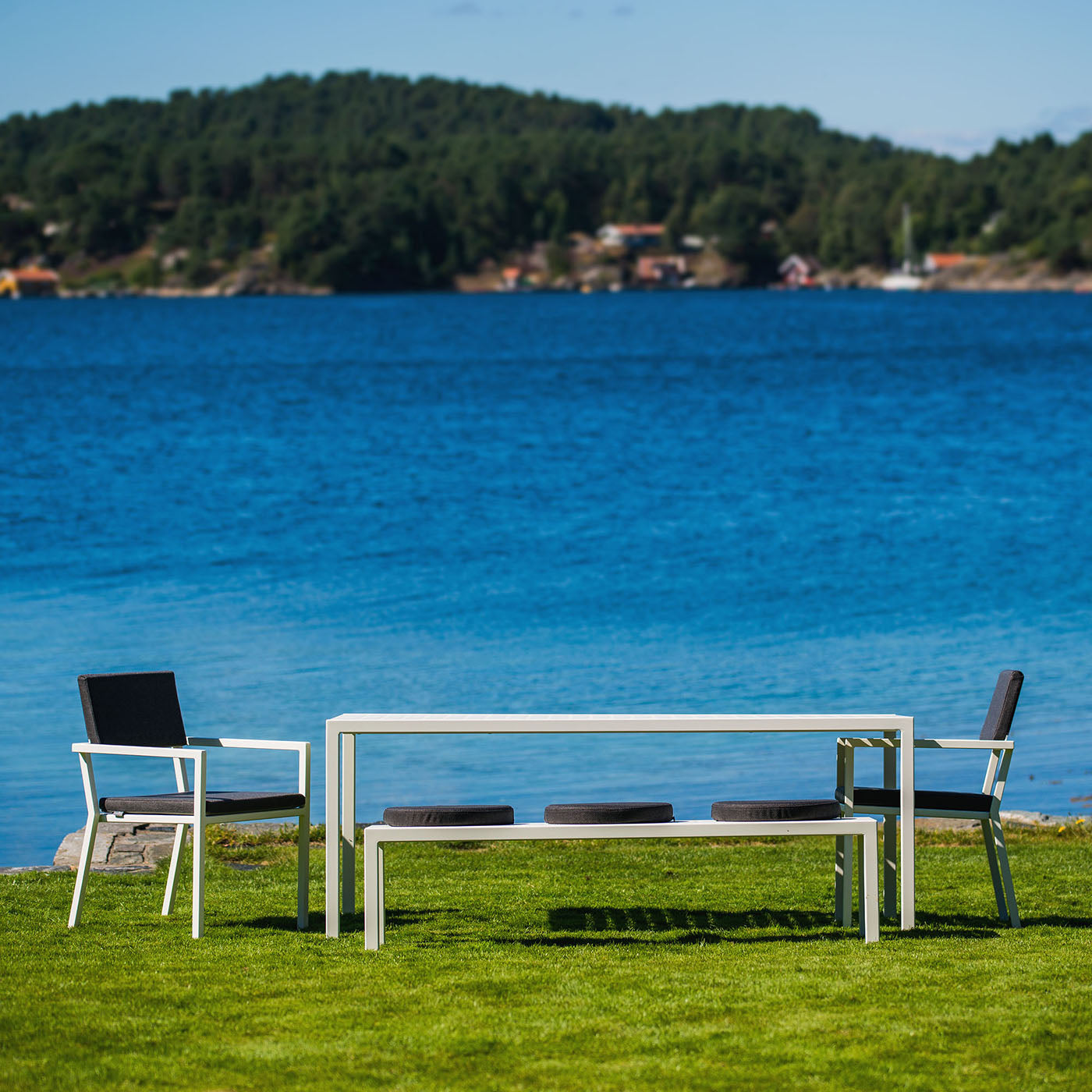 Enkle linjer designet i evigvarende materialer. Hver eneste strek er lagt med tanke på hvor vannet skal renne av. Med sitt minimalisiste utrykk, gjør designet seg godt i vågale farger og tekstilvalg. Møblene er laget i pulverlakkert aluminium og ruster ikke. Putene tåler selvfølgelig både regne og snø. Sundays design er hardhausen av designmøbler. Med våre møbler kan du starte sommersesongen allerede i påsken, og la terrassen på hytta eller hjemme gi deg et hint av sommer midt i skisesongen. |