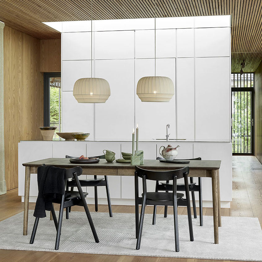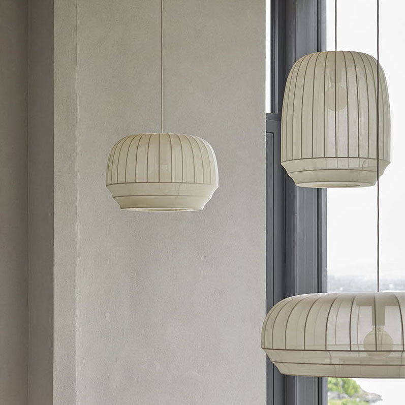 Den nye Tradition Pendant, fra den norske designduoen Morten & Jonas, er en moderne versjon av et hevdet håndverk. Denne distinkte og dekorative designen med sin finstrikkede nyanse vil skape en vakker atmosfære, komplementere innredningen din og forbedre opplevelsen av hjemmet. Skjermen er laget av off-white polyesterrør og strekkes forsiktig over den hvite metallrammen før den festes øverst og nederst. Tilgjengelig i tre former, "Small", "Tall" og "Large Oval", er strømkabelen også skjult i en ren silkeledning. Heng den tradisjonelle pendellampen enkeltvis over en seng, spisebord eller sofa for å gi et rom en koselig følelse eller klynge dem sammen for maksimal effekt selv når den er slått av. |