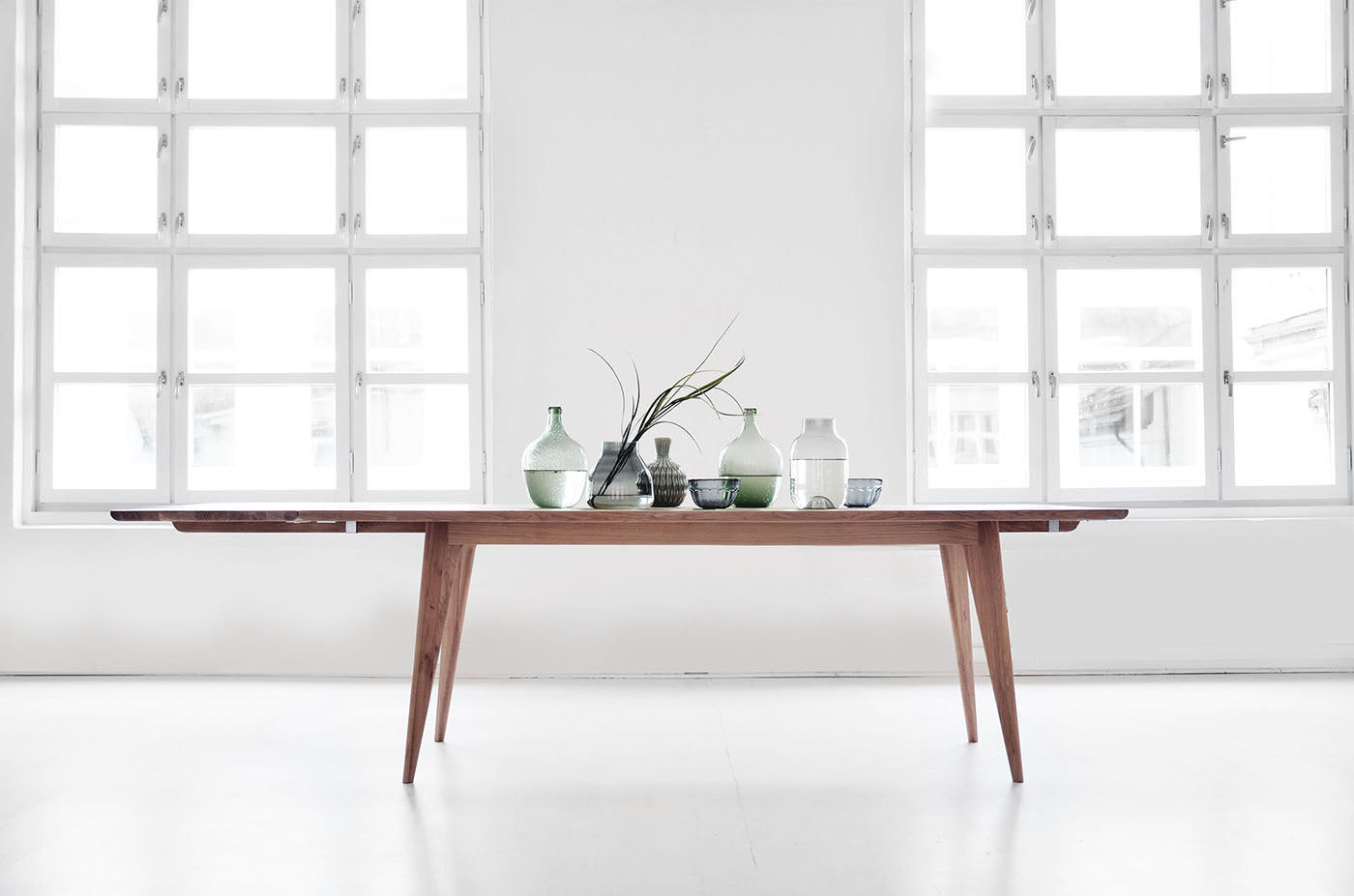 Viken har røtter i enkelhet og funksjonalitet fra skandinavisk modernisme. Med skråstilte ben og avrundet bordplate, oppleves bordet visuelt lett, nesten svevende. Vikenserien fås som runde og rektangulære bord i flere størrelser. De fleste av dem kan enkelt utvides for å gi plass til flere rundt bordet. |